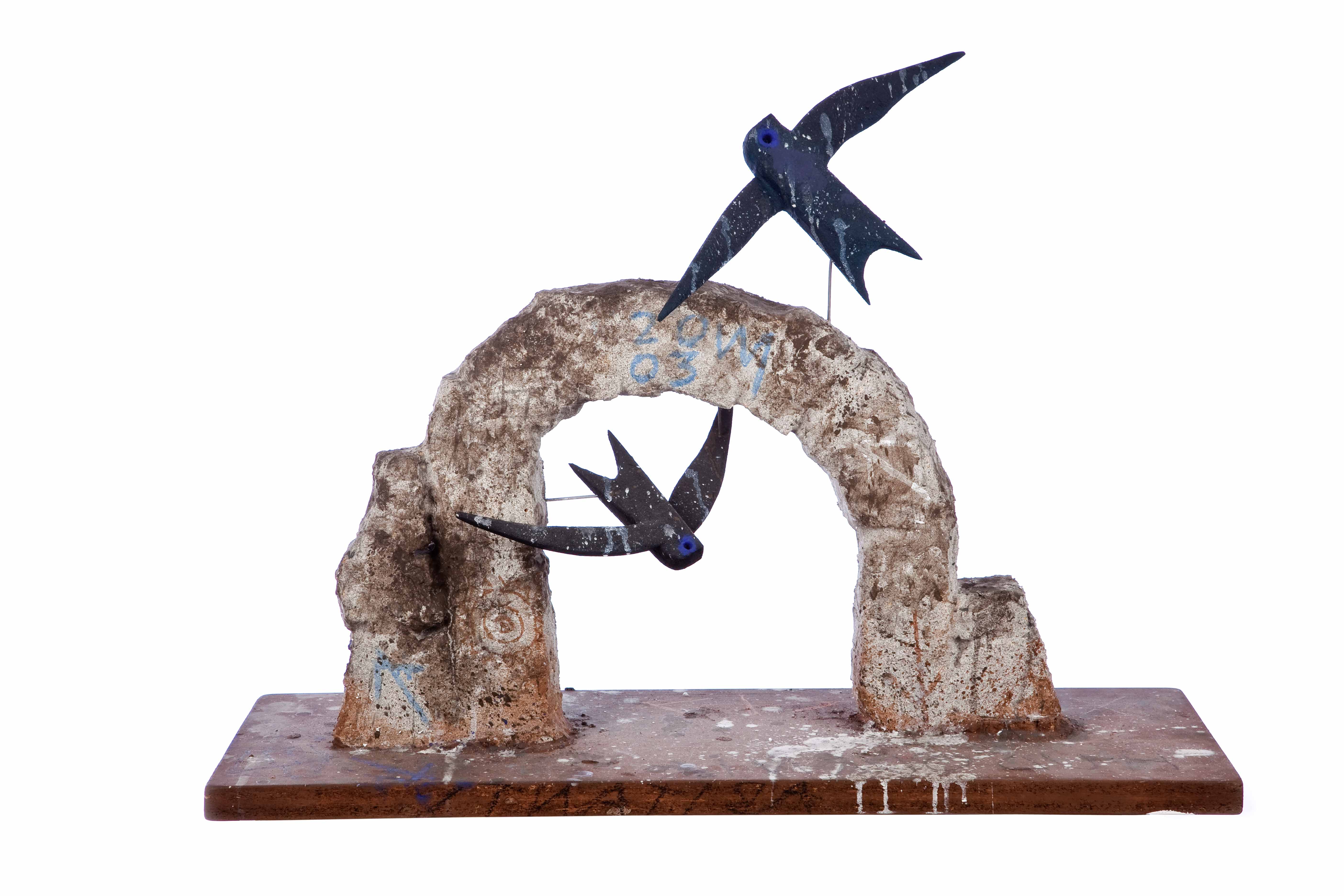 Ma le creature volanti di Makuc non rappresentano in generale una minaccia per l’uomo, sono anzi solitamente foriere di buone nuove, come le velocissime rondini in pittura e scultura dei primi anni Duemila che annunciano il ritorno della primavera in cieli azzurrissimi e che nelle loro forme tanto ci ricordano i leggeri aeroplanini di carta che eravamo soliti costruire a scuola e far volare durante le lezioni. O ancora gli approfonditi studi sul volo delle allegre allodole che ogni giorno sfidano le leggi della gravità come nelle ceramiche di fine anni Novanta o nei dipinti dei primi anni Duemila. Curioso è osservare come il nostro artista ami ritrarre anche se stesso mentre è intento a dipingere questi uccelli, armato di cavalletto, tela e pennelli, catapultandoci in un gioco infinito di specchi tra realtà e finzione come nel capolavoro Las Meninas di Diego Velázquez.