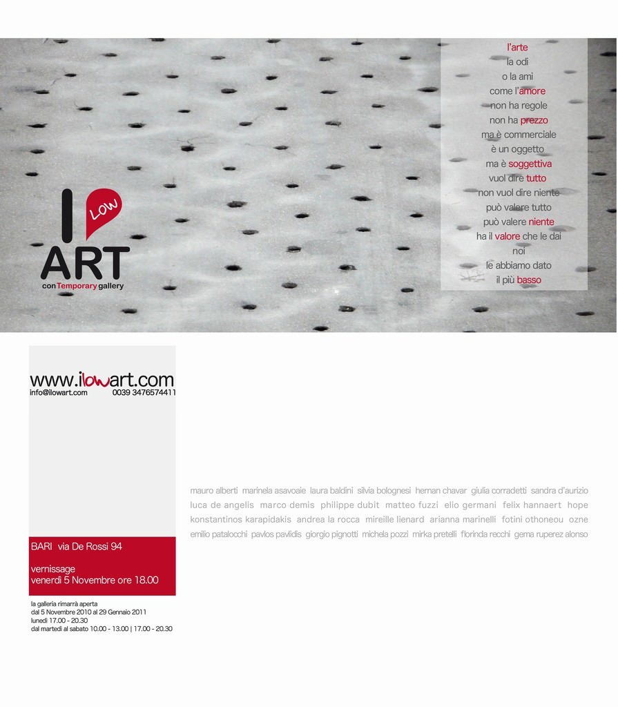 27 artisti italiani e internazionali, più di 150 opere di diverse tecniche e dimensioni, stili e medium si alternano in uno spazio completamente dedicato all’arte, in cui la parola d’ordine è LOW cost. Un evento che sdrammatizza e rende più accessibile il mercato dell’arte, invitando anche chi non ha ancora comprato la prima opera d’arte a farlo in soli tre mesi. Disegni, foto, dipinti e video per una mostra che soddisfa intenditori e appassionati ma anche coloro che desiderano avvicinarsi all’arte contemporanea per la prima volta.