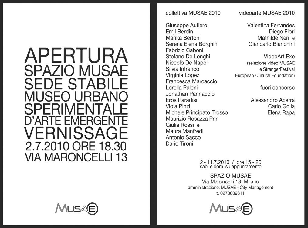 Spazio MUSAE, concepito quale vetrina di scambio con il territorio milanese, aprirà le porte per una settimana, durante la quale alcuni artisti della prima selezione 2010 daranno la possibilità a collezionisti e non, di acquistare le proprie opere.