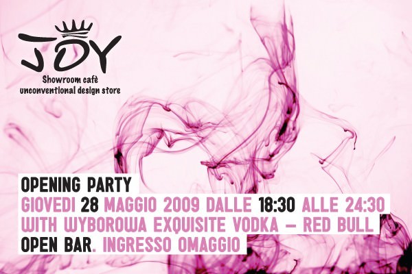 Il 28 Maggio 2009 JOY Showroom Cafè si presenta con una serata inaugurale free open bar Wyborowa Exquisite Vodka- Red Bull, dalle 18.30 alle 24.30.