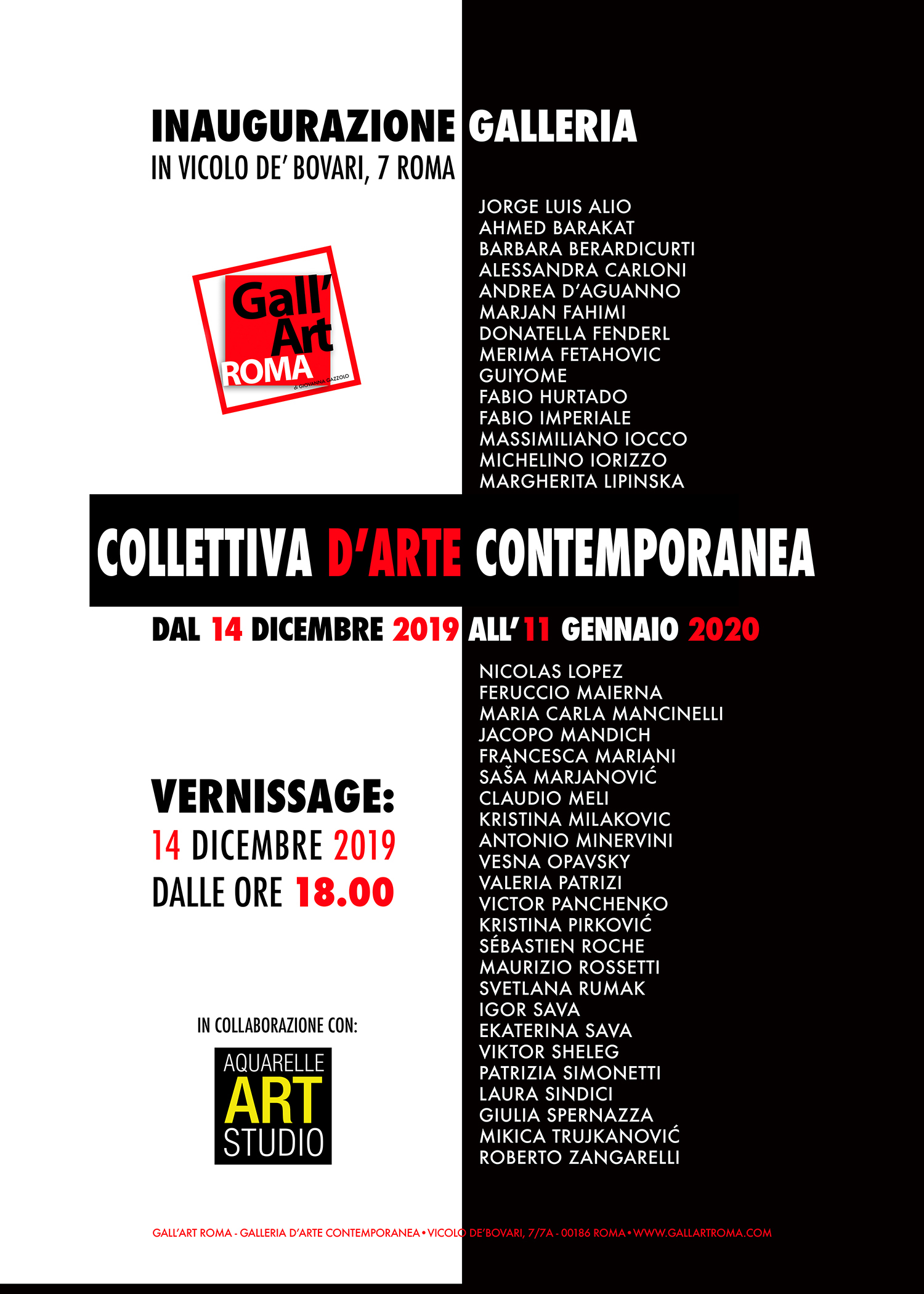 Il 14 dicembre dalle ore 18.00 vi aspettiamo tutti per festeggiare l'apertura della nuova galleria Gall'Art Roma di Giovanna Gazzolo in Vicolo de' Bovari, 7 nel cuore della vecchia Roma e lo facciamo a modo nostro, con una grande collettiva dove ci saranno artisti italiani e di altre nazionalità, artisti già affermati ed emergenti e altri che esporranno con noi per la prima volta. Sì, le nostre porte si apriranno davvero a tanti di loro e questo non può che farci un immenso piacere.