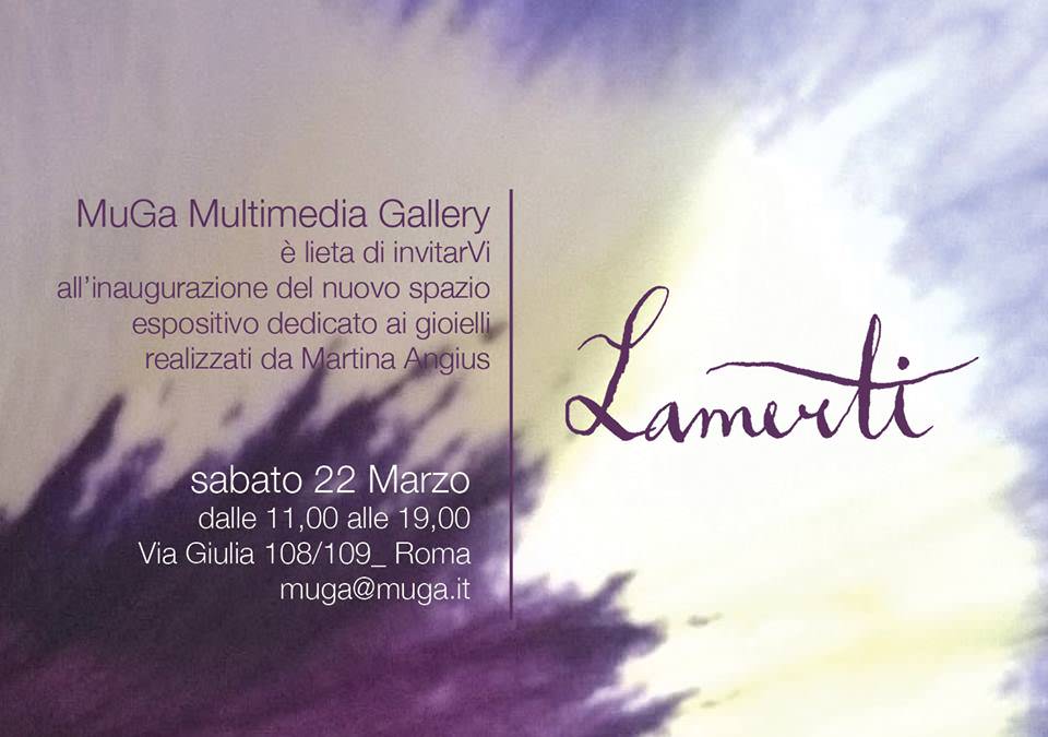 Presentazione del nuovo spazio all’interno della galleria MuGa, dedicato ai gioielli Lamerti realizzati dall’artista Martina Angius.In questa occasione verrà presentata la collezione P/E 2014 contemporaneamente ad Ecosistema, opera che anticipa il nuovo progetto installativo dell’artista.