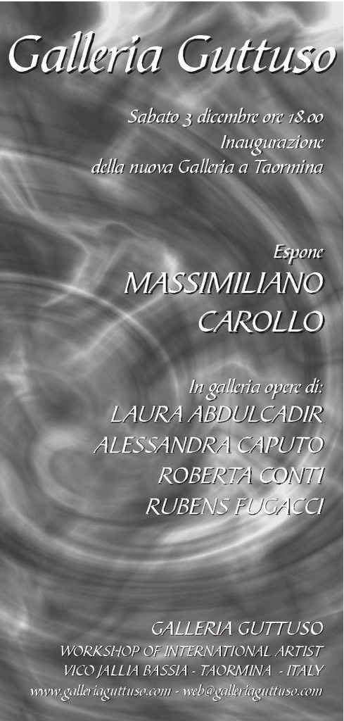 Massimiliano Carollo presenterà la sua recente ricerca pittorica sui personaggi che hanno contrassegnato la sua formazione giovanile. I grandi volti di Warhol, Malatesta, Shostakovic, Einstein, Miller, ecc. sono i testimonial di questa scenografia pirallendiana che narra la vita del giovane artista.