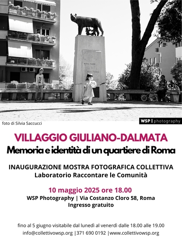 WSP Photography, è lieta di presentare “Villaggio Giuliano Dalmata. Memoria e Identità di un quartiere di Roma” la mostra fotografica collettiva che inaugurerà sabato 10 maggio alle ore 18.00 presso la nostra sede in Via Costanzo Cloro 58, Roma.
