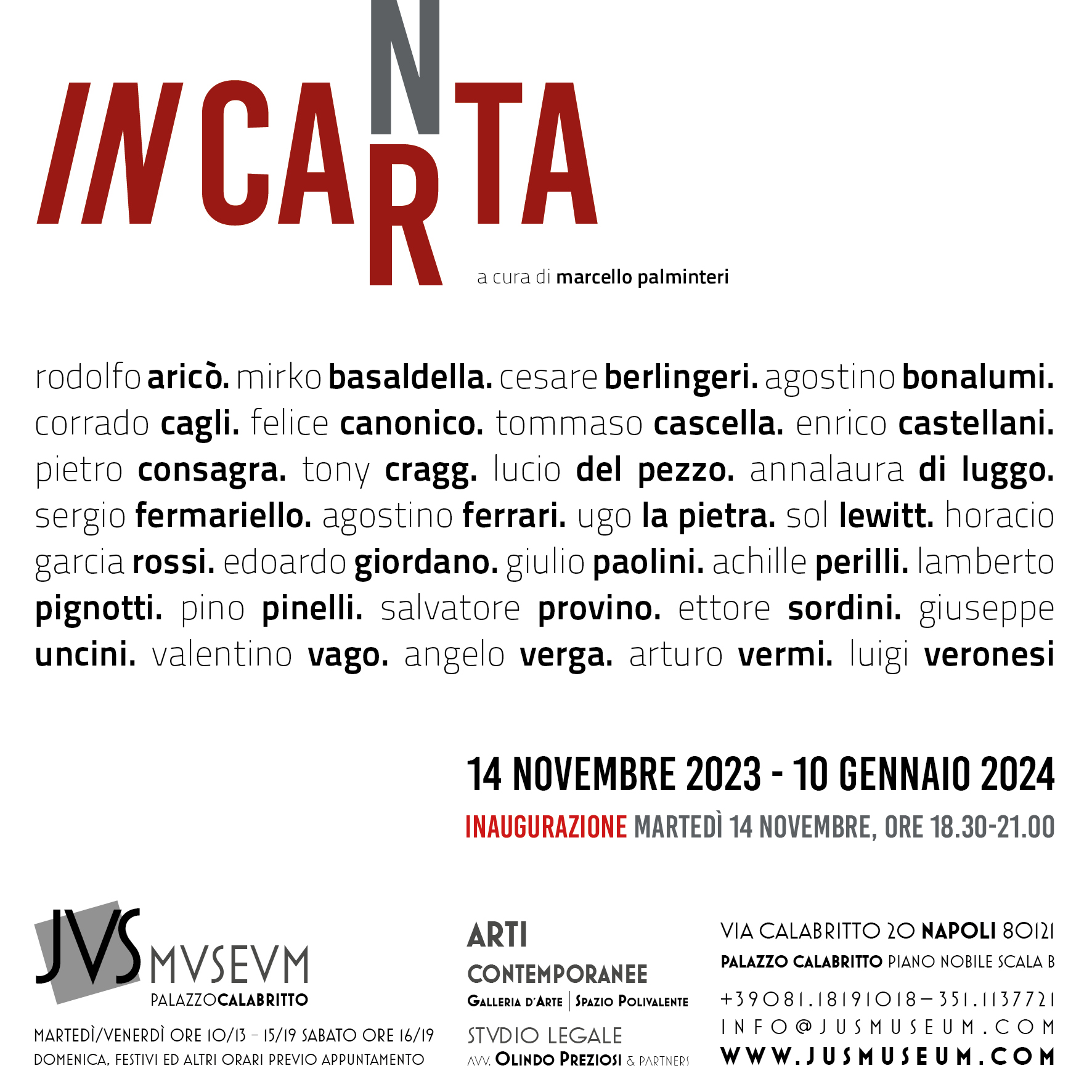 NAPOLI. Martedì 14 novembre dalle 18.30 alle 21.00, presso lo JUS Museum | Palazzo Calabritto (via Calabritto 20, piano nobile, scala B) si terrà l’opening della mostra “INCARTA / INCANTA”, a cura di Marcello Palminteri.