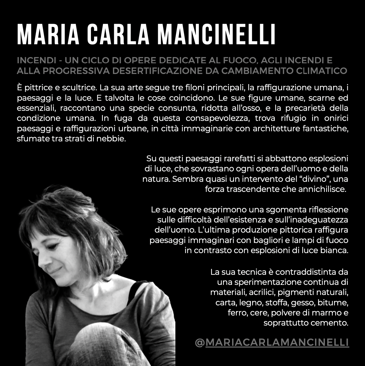 L’evento è focalizzato sulla tematica degli incendi che stanno distruggendo boschi e foreste nel mondo e si avvale delle opere d’arte di Maria Carla Mancinelli, dei testi di Maria Teresa Di Clemente e delle musiche per oboe scelte e suonate da Noemi Serrao.