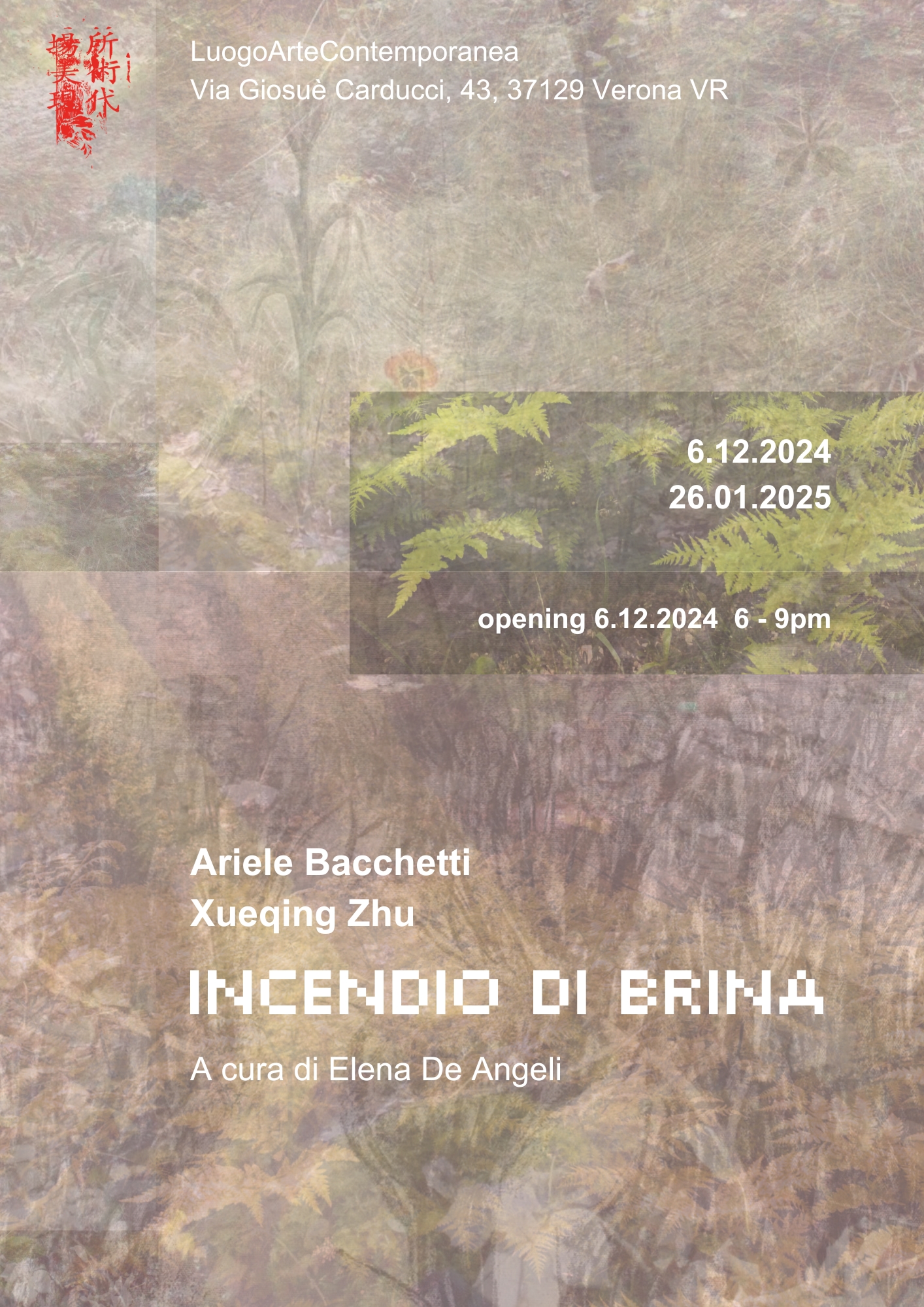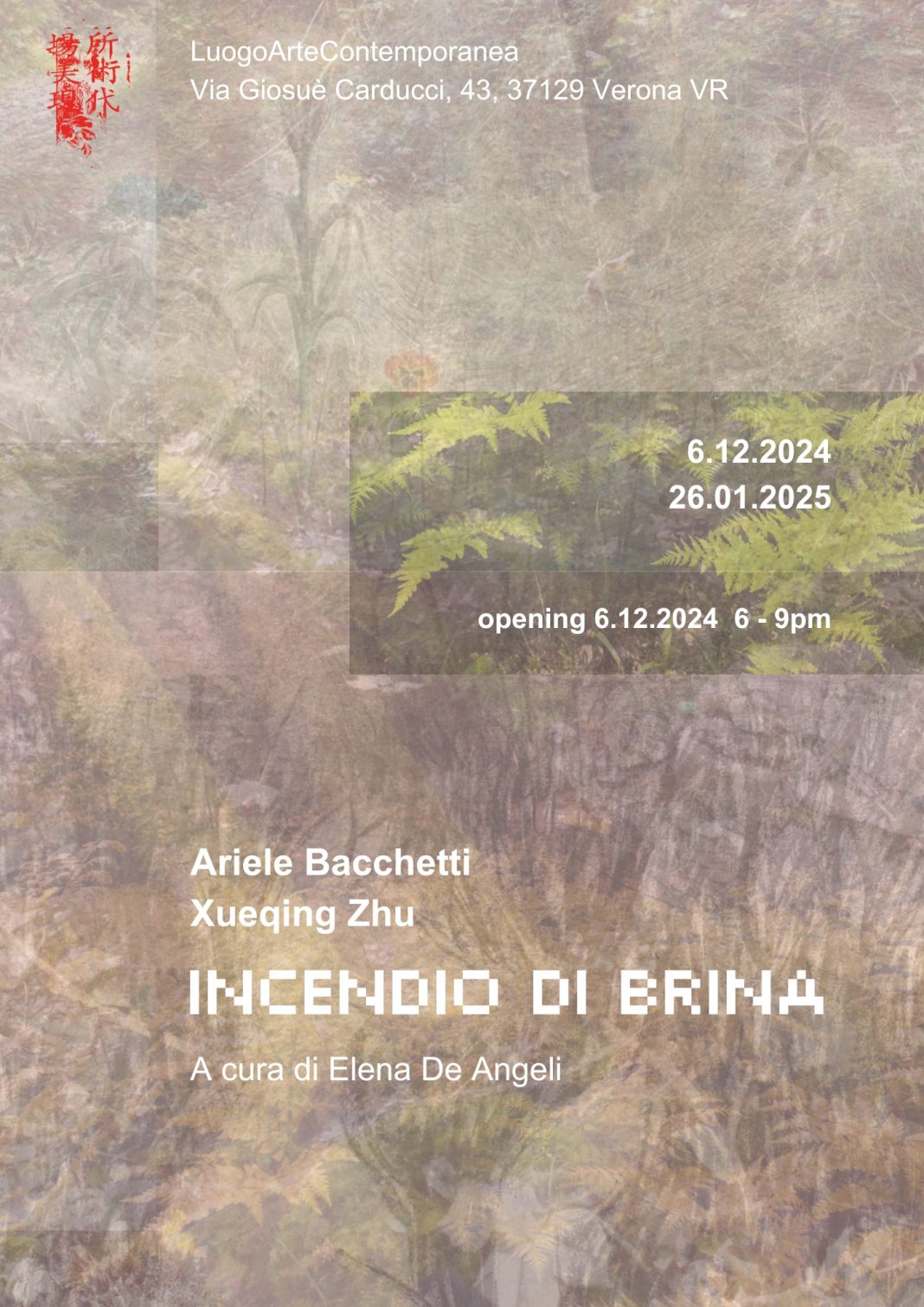 'Incendio di brina' rappresenta un antitetico paradosso, così come antitetiche e paradossali sono le atmosfere nei lavori degli artisti in mostra. Ariele Bacchetti, con base a Venezia, e Xueqing Zhu, vive e lavora tra Cina e Italia, hanno studiato pittura frequentando durante gli stessi anni l’Atelier F presso l’Accademia di Belle Arti di Venezia, entrando in contatto con realtà quali Extra Ordinario Workshop a Venezia e Dolomiti Contemporanee nell’Ex Villaggio Eni a Borca di Cadore. Il loro lavoro sviluppa un nuovo dialogo nello spazio di Luogo Arte Contemporanea, nato nel 2023 su iniziativa di Daniela Alastra e situato a Verona al n°43 di via Carducci, in un contesto urbano in cui le tradizionali attività commerciali sono state via via riqualificate da nuove iniziative a carattere creativo e culturale.