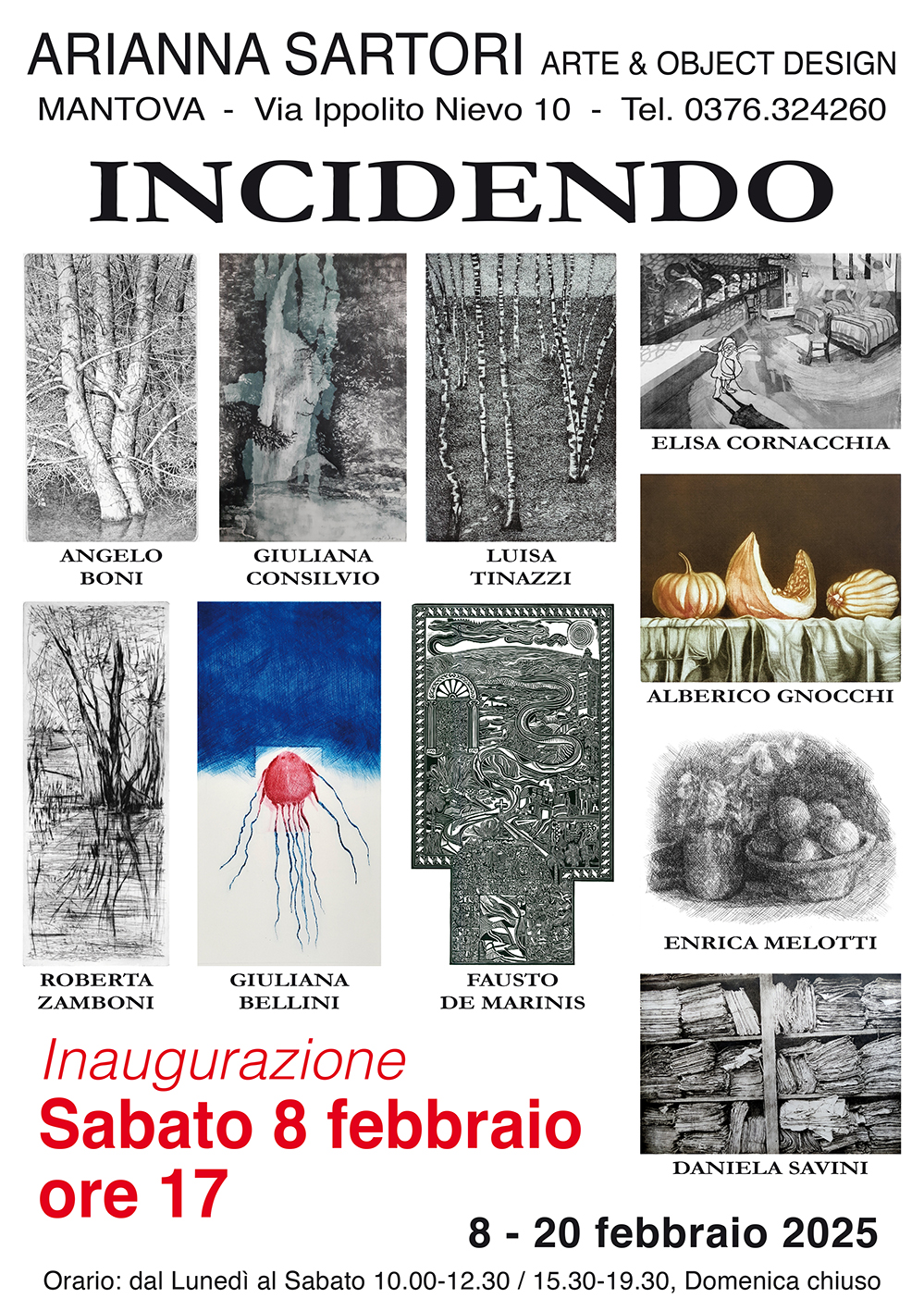 La Galleria Arianna Sartori di Mantova, nella sala di via Ippolito Nievo 10, il prossimo Sabato 8 febbraio alle ore 17.00, inaugura la rassegna “INCIDENDO”. Alle pareti sarà possibile ammirare le incisioni di Giuliana Bellini, Angelo Boni, Giuliana Consilvio, Elisa Cornacchia, Fausto de Marinis, Alberico Gnocchi, Enrica Melotti, Daniela Savini, Luisa Tinazzi, Roberta Zamboni.