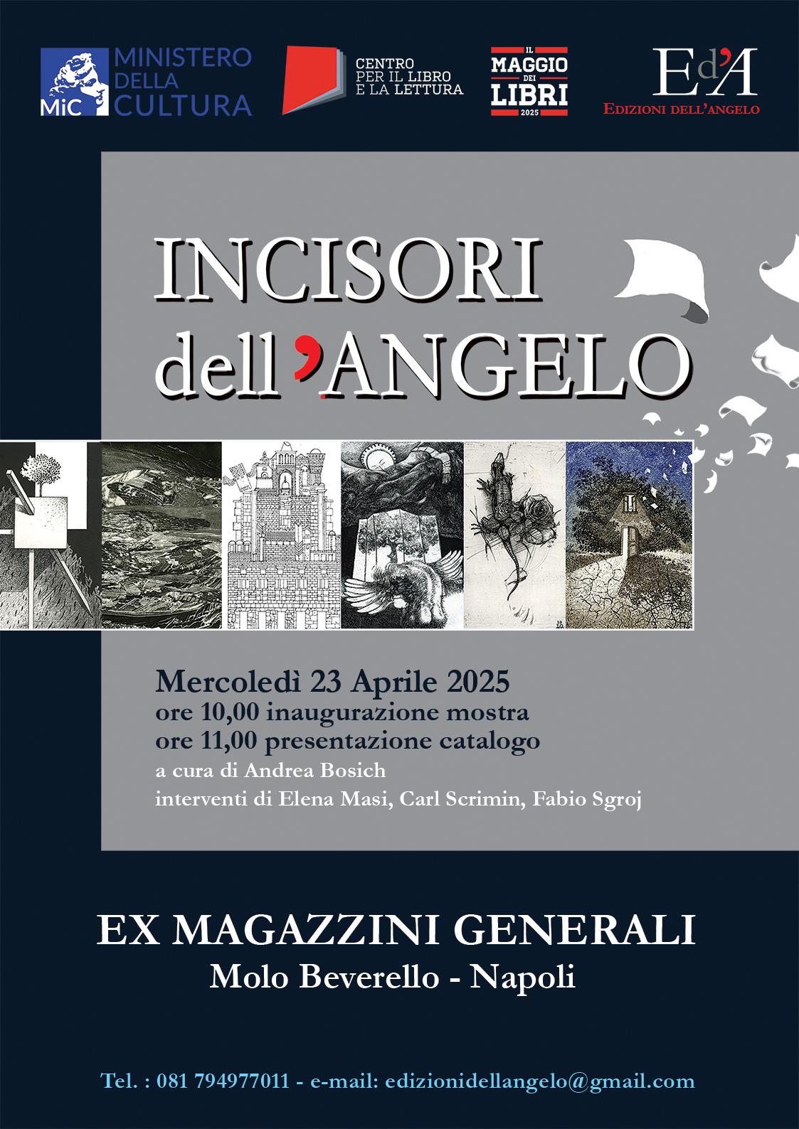 Mercoledì 23 Aprile, alle ore 10,00, a Napoli presso gli "Ex Magazzini Generali" sarà inaugurata la mostra d'arte grafica "Incisori dell'Angelo" e, alle ore 11,00 la presentazione dell'omonima pubblicazione, curata da Alberto Randisi, che riporta il catalogo generale delle plaquettes realizzate dalle "Edizioni dell'Angelo" con una rassegna degli artisti incisori che hanno collaborato nel corso della trentennale attività, 1994-2024. Saranno in mostra le plaquettes con incisioni originali di: R. Amato, A. Beuchat, M. Boiani, A. Bosich, E. Convento, G. Ginex, U. Giovannini, L. Lanari, R. Margheri, V. Mezzetti, T. Pecoraro, V. Piazza, G. Sciacca, F. Sgroj, M. Stragliati, G. Vassallo, che hanno illustrato i testi di: F. Alaimo, M. Attanasio, A. Castrovinci, G. Condorelli, A. Gerbino, N. Grato, J. Laforgue, P. Lisi, P. Longo, D. Martinez, E. Masi, L. Paglia, F. Raimund, H. Raimund, N. Romano, P. Romano, E. Salibra, A. Scandurra, W.B.Yeats, S. Vilardo, L. Zinna, A. Zulinos.