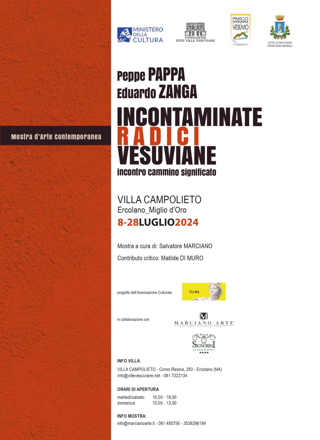 Lunedì 8 luglio 2024 alle ore 18.00, nella splendida Villa Campolieto sul Miglio d’Oro di Ercolano, si terrà l’evento di apertura della mostra “Incontaminate radici vesuviane” con le opere degli artisti Peppe Pappa ed Eduardo Zanga. La mostra, promossa dall’Associazione Culturale TU.RA, è realizzata con il contributo dell’Ente Parco Nazionale del Vesuvio, della Fondazione Ente Ville Vesuviane e si avvale del patrocinio morale del Comune di Ercolano.