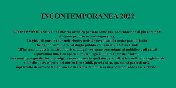 INCONTEMPORANEA 2022 è un format pensato come una presentazione di più cataloghi ed opere, esposte in una mostra, in contemporanea. Un gioco di parole che vuole riunire artisti contemporanei provenienti da molte parti d’Italia che hanno visto i loro cataloghi pubblicati e curati da Silvia Landi e, attraverso una mostra, presentati al pubblico nello stesso momento dell’esposizione al Museo Ugo Guidi di Forte dei Marmi.
