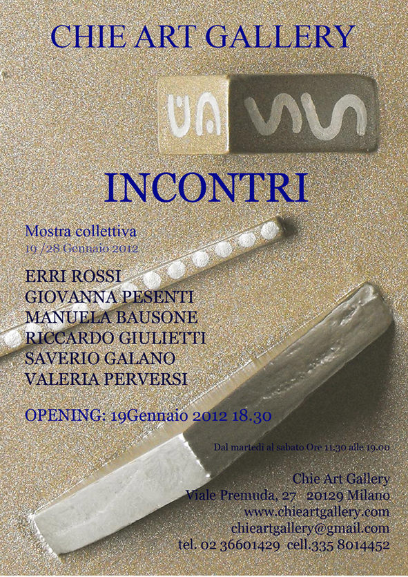 E’ con la mostra collettiva “Incontri” che la Chie Art Gallery vuole confrontare sei artisti che presentano nei loro lavori particolari tematiche e tecniche differenti, ma che hanno come comune denominatore l’amore per l’arte pittorica. Infatti, anche se provengono da ambiti artistici diversi si sono riuniti tutt’ insieme senza distinzione di percorso artistico e anni di lavoro in questo campo, per impegnarsi ad esplorare con la propria creatività e fantasia il loro mondo interiore. Molto diversi tra loro i generi in mostra: dall’astratto, anche geometrico, all’informale passando anche per un espressionismo quasi fiabesco. Questo progetto, quindi, è anche una bella opportunità per presentare al pubblico le nuove opere e non, di questi artisti e per permettergli di incontrarli e dialogare con loro sulle tematiche trattate e le tecniche utilizzate, così da trasmettere le loro sensazioni. In mostra opere di: Erri Rossi, Giovanna Pesenti, Manuela Bausone, Riccardo Giulietti, Saverio Galano e Valeria Perversi.