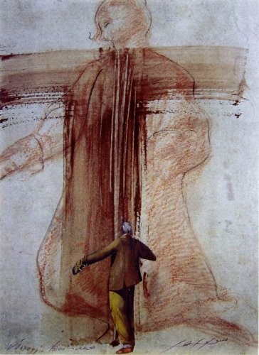 Questo: una figura d'uomo - un crocifisso. La testa è alzata, le braccia larghe imitano la croce, il piede avanzante, la giacca leggera, il pantalone con foggia di una moda - demodé. L'uomo sale o salirà sulla sua croce. La sua croce è un segno lontano, leggero, aereo e il legno non è che una pennellata bruna.