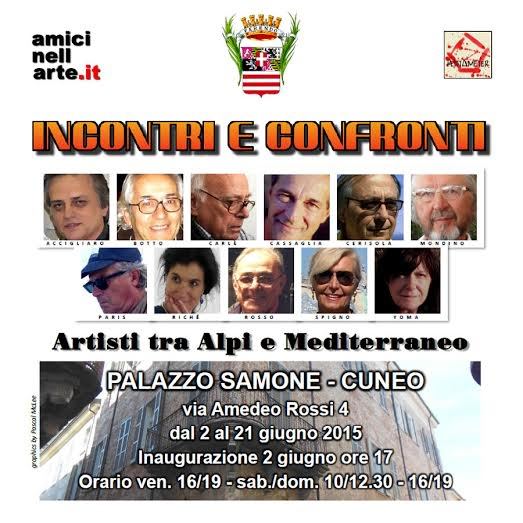 Incontri e confronti – Artisti tra Alpi e Mediterraneo è una mostra che viene organizzata quale opportunità di incontro e confronto tra artisti liguri, francesi e cuneesi che hanno segnato con le loro opere, con la loro costanza, con la loro passione d’artisti, perlomeno nei propri territori, la seconda metà del secolo scorso caratterizzata da grandi mutamenti nelle arti figurative. Essi, nonostante i pochi contatti avuti tra loro, sono accomunati da un unico filo conduttore: quello di essere convinti che forme, segni e colori possano esprimere e realizzare concetti astratti di armonia e bellezza