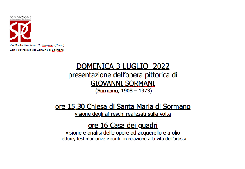 Ore 16:00 alla Casa dei Quadri in piazza Santa Maria a Sormano (Como) Analisi opere. Letture, testimonianze e canti riferiti alla vita e all’opera dell’artista.