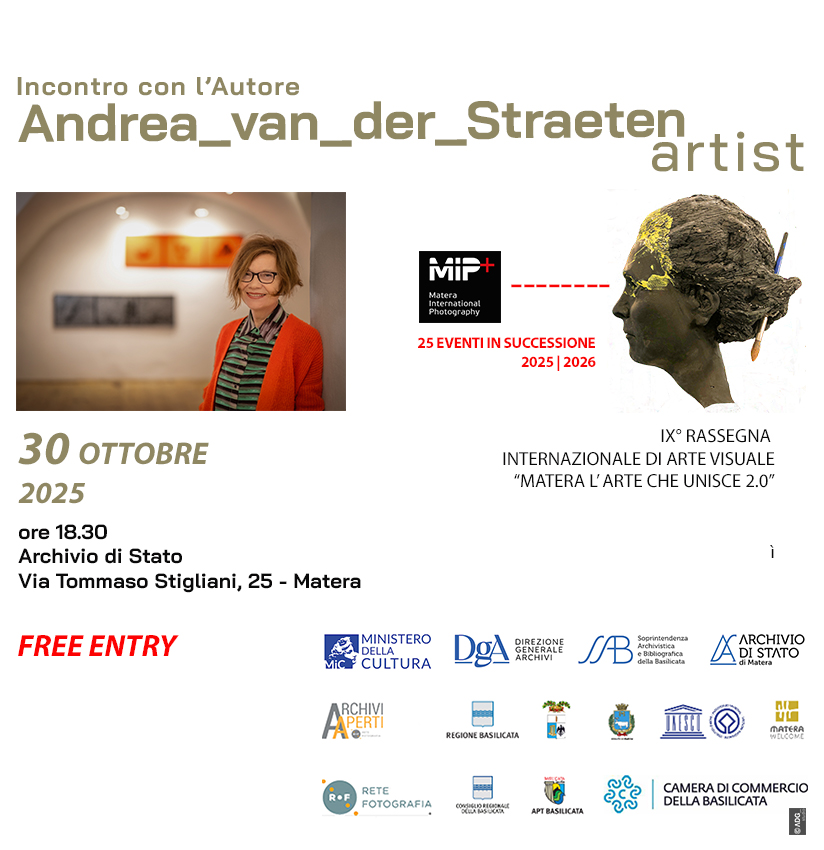 Il MIP - Matera International Photography presenta, all’interno della nona edizione della rassegna internazionale di arte visuale “Matera l’Arte che Unisce”, l’incontro con l’artista Andrea van der Straeten, in programma giovedì 30 ottobre 2025 alle ore 18.30 presso l’Archivio di Stato di Matera.