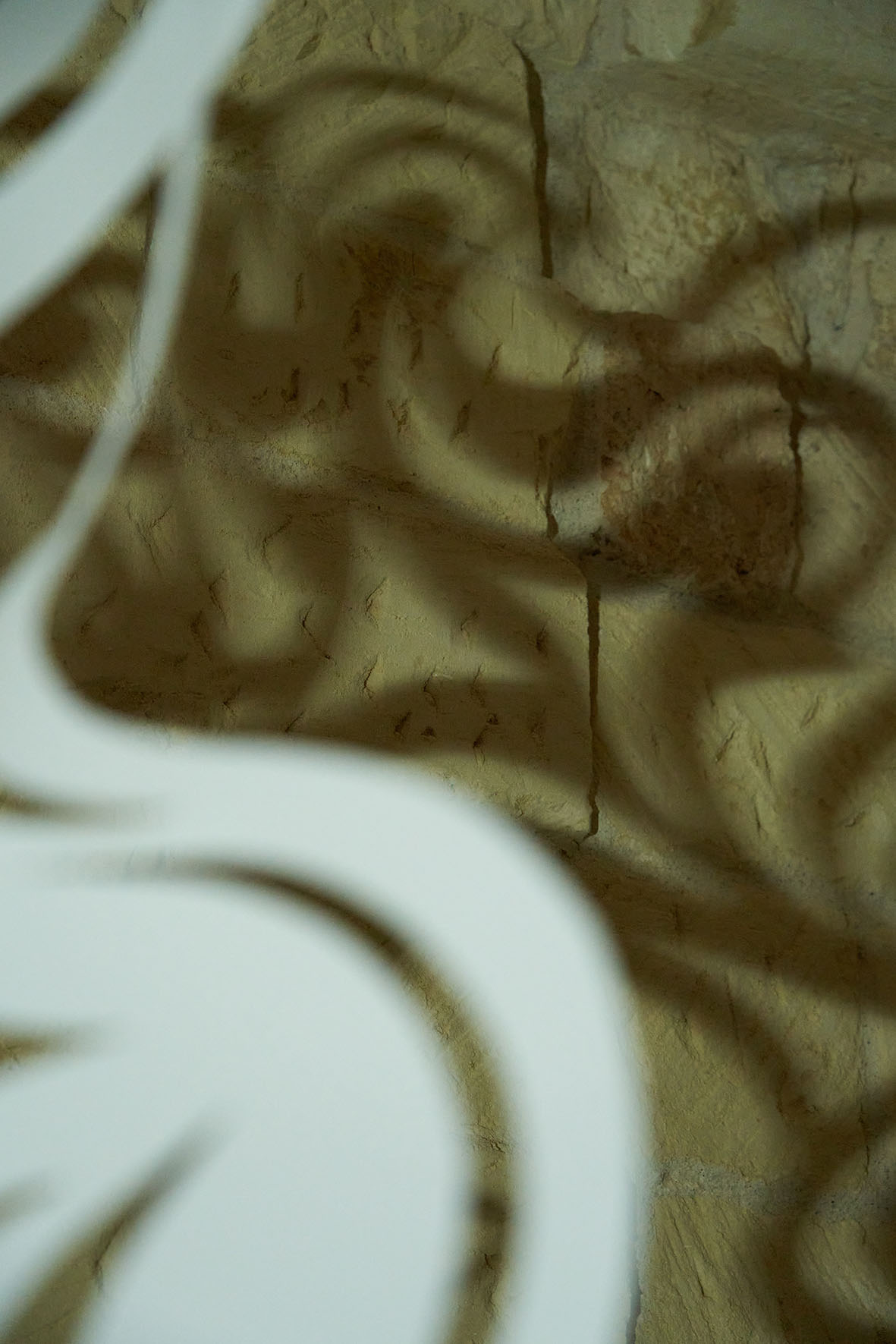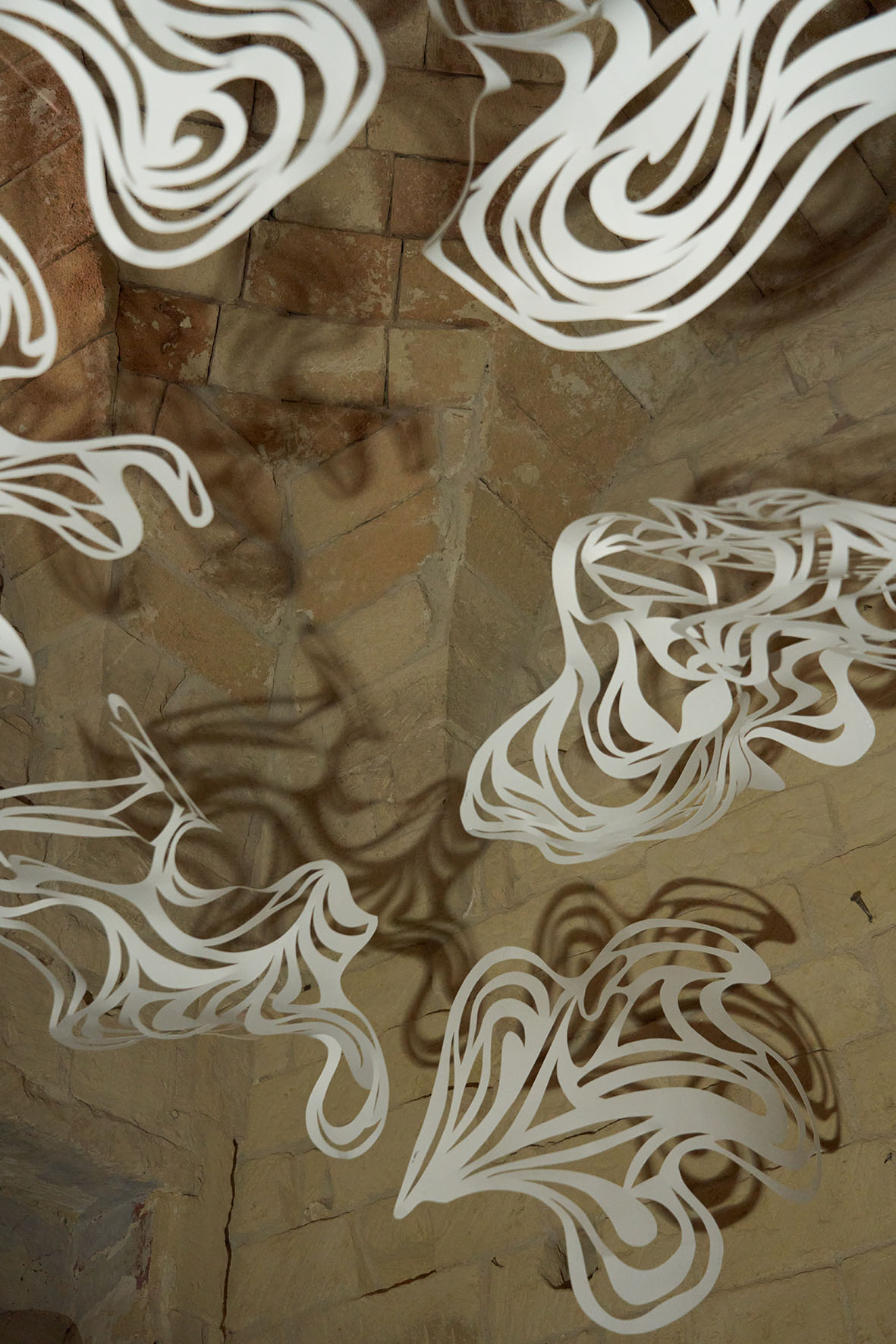 Incorporea, installazione site-specific di nuvole di carta di p.pourri. Ritagli di ombre imprimono la pietra, creando un tempo di sospensione e attesa, accompagnati dalle note di “Aerophonia” di Neil Leonard.