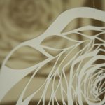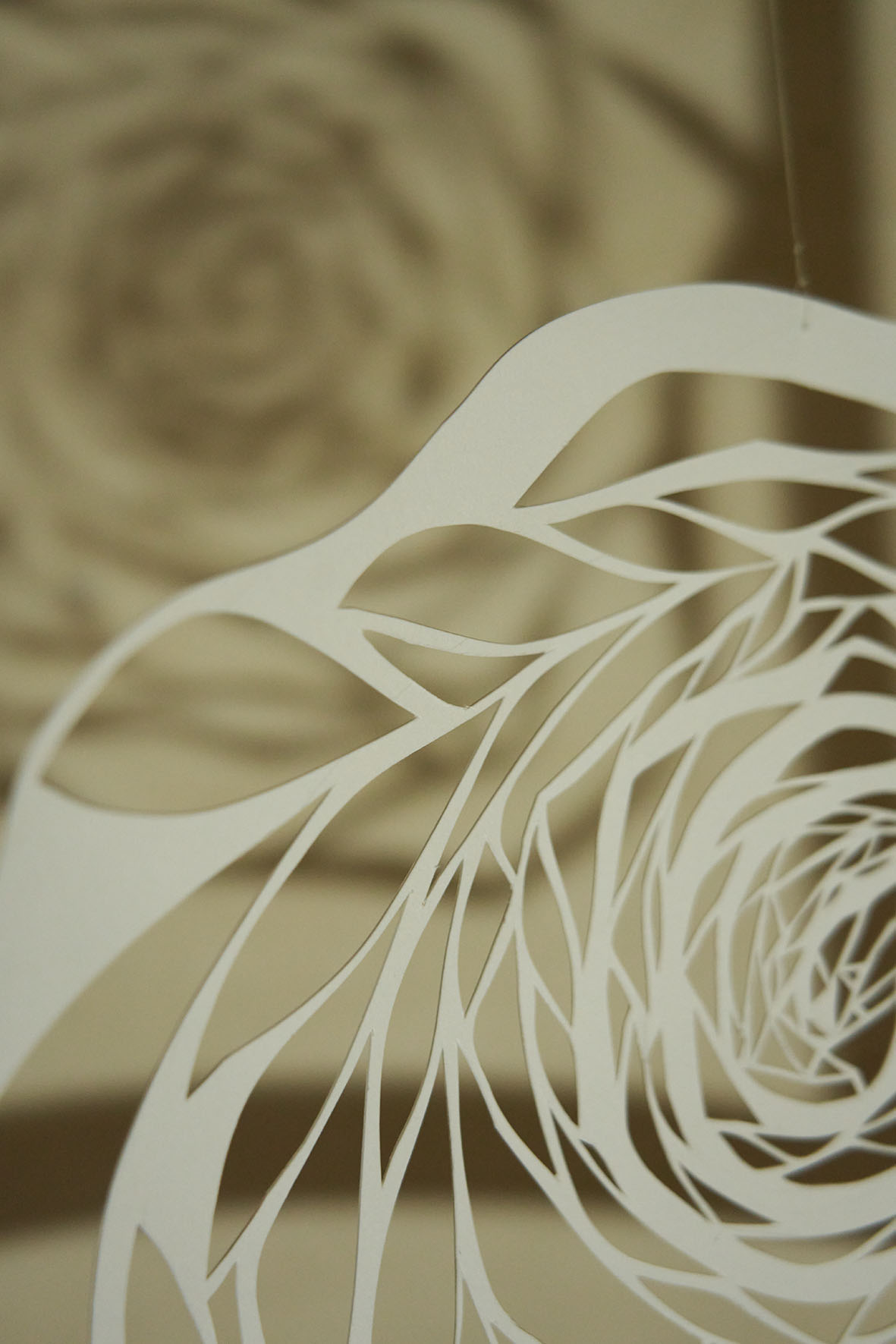 Un pot-pourri di pieni e vuoti minuziosamente realizzati con il bisturi. I tagli sono precisi e incisivi, creano un ricamo unico. L’atto dell’incisione è sacro, sintesi di un atto creativo interiore, senza alcun disegno preparatorio. La loro composizione genera nuvole di carta, che illuminate proiettano sullo spazio il loro opposto. La luce proiettata sulla parete genera l’ombra del ricamo; è lei la protagonista: si allunga, si restringe, danza. Come una nuvola di fumo densa e voluminosa, l’ombra si mostra nella sua maestosità.