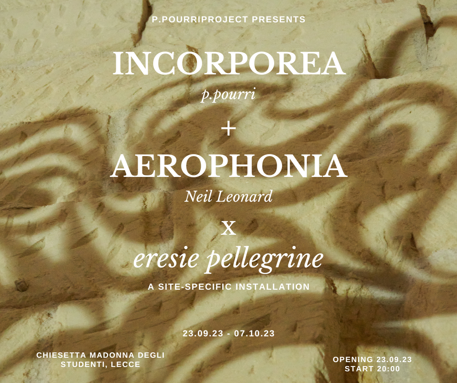Sabato 23 settembre 2023 alle ore 20:00 presso la Chiesetta via Madonna degli Studenti inaugura INCORPOREA + AEROPHONIA x Eresie Pellegrine, prima installazione site-specific di p.pourri nel luogo che ha originato il processo creativo dell’artista.