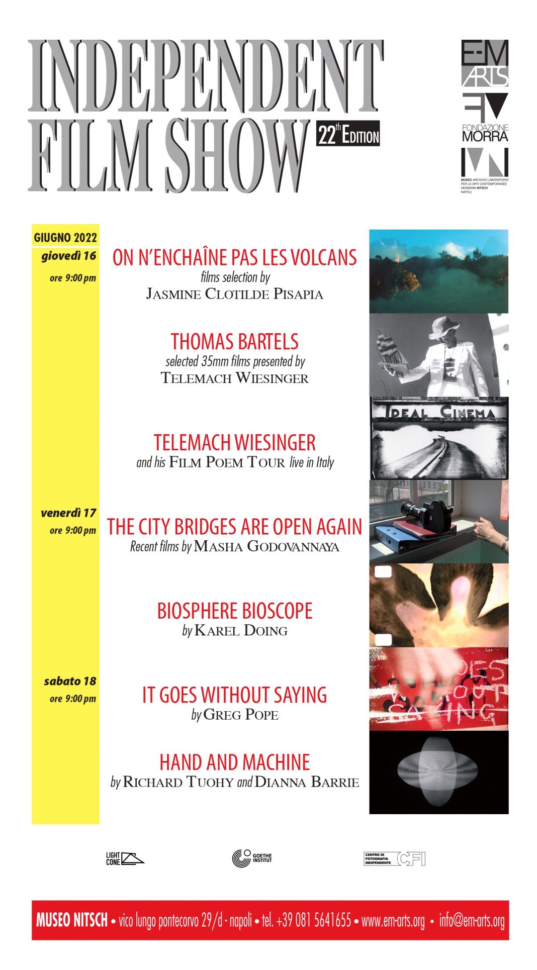 Independent Film Show 22 edition, tra le più innovative rassegne internazionali di experimental film, dal 2001 coordinata da Raffaella Morra e organizzata da E-M ARTS e Fondazione Morra, in collaborazione con Goethe Institut Neapel, si arricchisce con un segmento immersivo ed educativo programmando la lezione Photographic darkroom works di Telemach Wiesinger (Museo Hermann Nitsch 16.06 ore 18:30) e con il Centro di Fotografia Indipendente i workshops Phytography di Karel Doing (Vigna San Martino 17.06 ore 11:00) e Neither Black nor White: simple tinting and toning in 16mm di Richard Tuohy e Dianna Barrie (Centro di Fotografia Indipendente 19.06 ore 10:30).