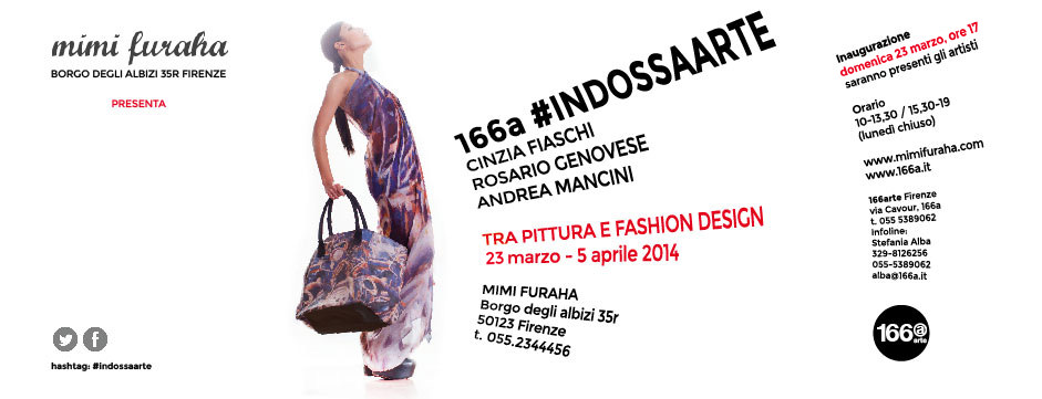 Cinzia Fiaschi, Rosario Genovese e Andrea Mancini. Tre artisti diversi per linguaggio, genere e cultura ma uniti in un progetto ideato e coordinato da Stefania Alba che partendo dall'atelier 166a di Via Cavour a Firenze, un nuovo punto d'incontro di arte e di pensiero, si ispira alle opere dei tre maestri per dare nuove forme alle loro creazioni. Nasce così un marchio - il 166a - che allargando i tradizionali confini della pittura, non più limitati al quadro, produce le "ArtBags", le originali borse d'arte, e i nuovi Foulards destinati al pubblico degli appassionati dell'arte e del nuovo dalla forte personalità. Arte da indossare, quindi, con le immagini di Fiaschi Genovese e Mancini che riecheggiano su ognuno dei prodotti presentati in questo evento. Universi paralleli contemporanei fatti di segni e colori diversi e lontani, eppure così vicini e possibili nel progetto del 166 che ci convincono dell'infinito potenziale di emozione e bellezza che l'arte riesce ancora a regalarci.