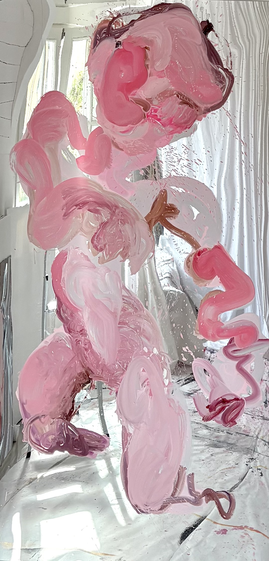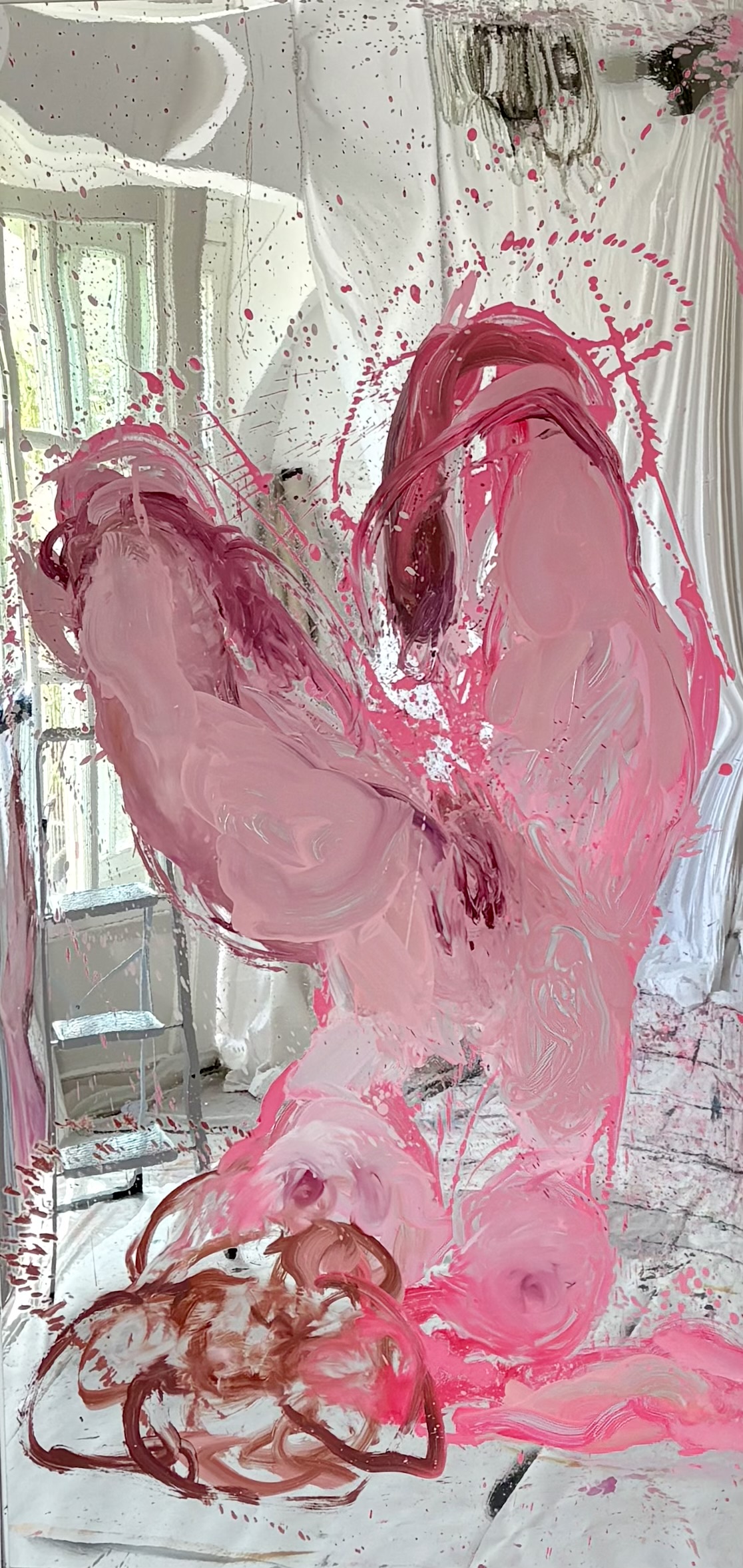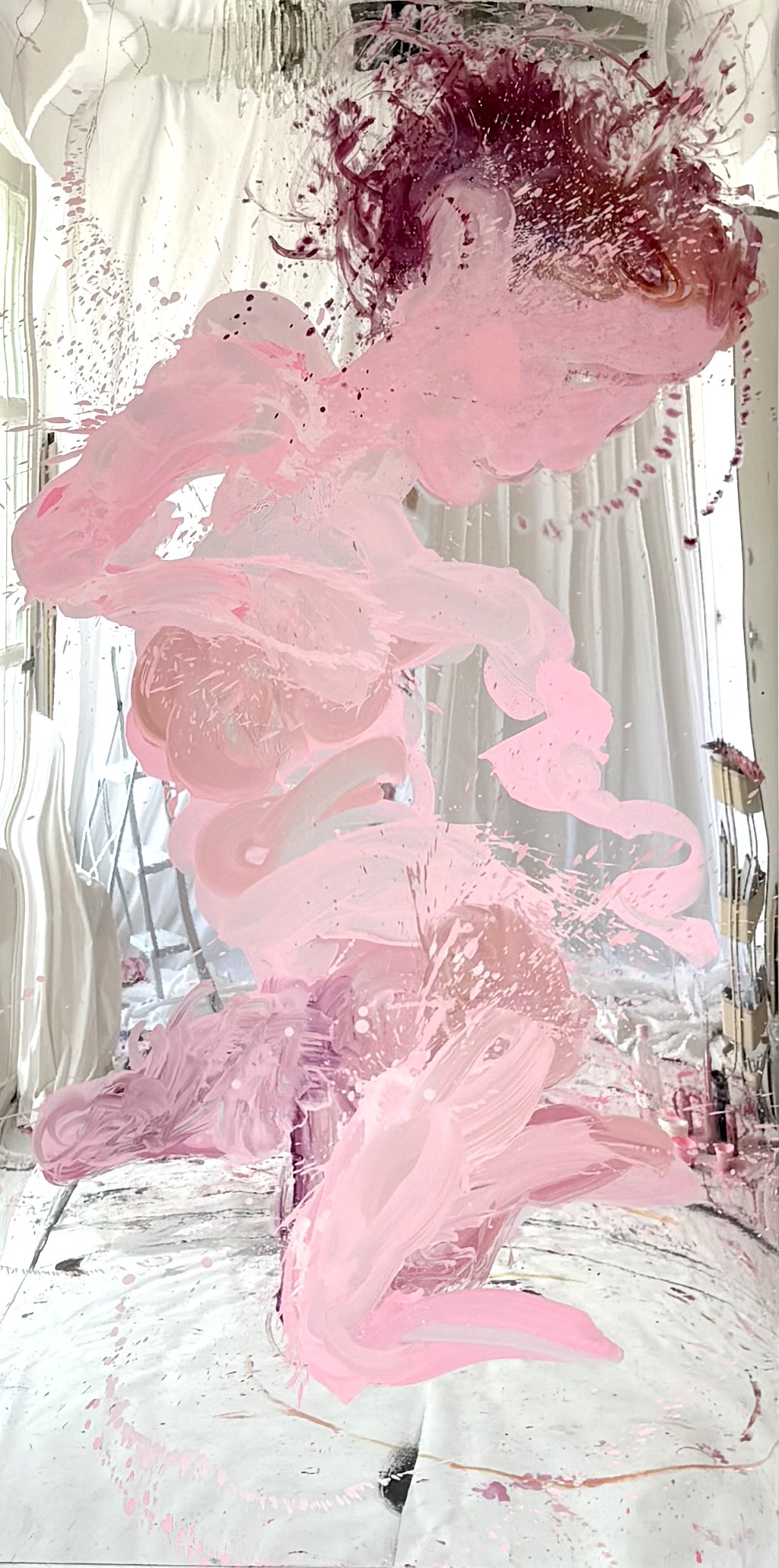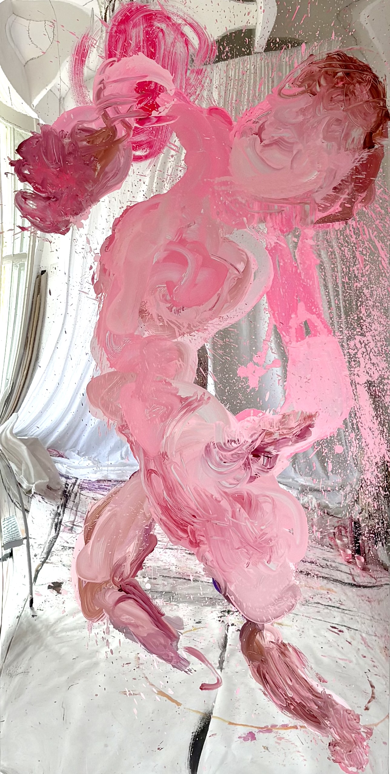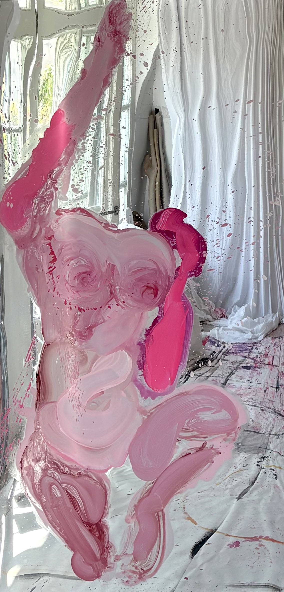 In quest’occasione i supporti utilizzati dall’artista sono superfici specchianti in cui è sempre presente una figura femminile, autoritratti e ritratti che, nell’azione del dipingere, si riflettono tra le profondità sensibili della pittura. Negli ultimi lavori concepiti per la mostra alcune parti di queste figure si staccano dalle superfici bidimensionali e diventano forme amorfe sagomate sul supporto in pvc a specchio; fluttuano così nello spazio sconfinando anche nella scultura.