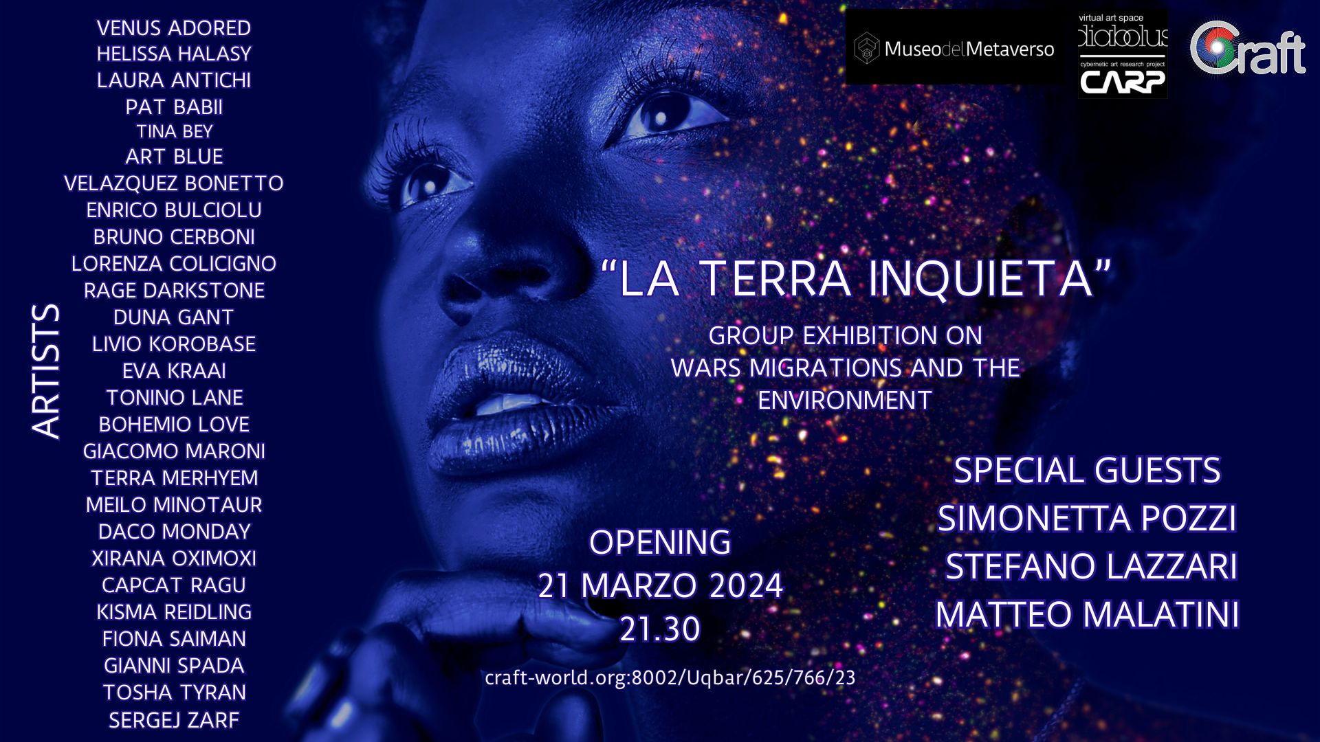 La mostra collettiva "La Terra Inquieta", organizzata dal Museo del Metaverso, è un evento artistico che esplora le tematiche delle guerre, della migrazione e dell'ambiente attraverso le opere di 27 artisti internazionali. Il titolo si ispira a quello della Triennale di Milano del 2017, a sua volta mutuato dalla raccolta di poesie di Édouard Glissant, autore caraibico che ha dedicato la sua intera opera all’analisi e alla celebrazione della coesistenza di culture diverse. La mostra presenta venticinque installazioni che includono sculture 3D, video, fotografie e opere create con l'intelligenza artificiale. Situata nel Metaverso Craft World in Opensim, questa esposizione invita alla riflessione sulle sfide globali del nostro tempo, offrendo nuove prospettive e stimolando il dialogo su questioni cruciali per il futuro dell'umanità.