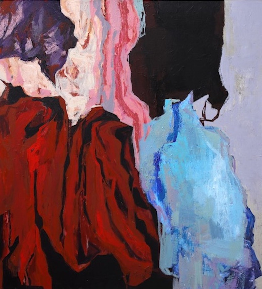 Il viaggio attraverso le trame di luce inizia con le tele raffiguranti Il peso della lana e Sete uzbeke, olio e fili di seta, rispettivamente del 2008 e del 2010: matasse colorate stese su pioli di legno a catturare lo sguardo come una tavolozza di colori sgargianti, che va dai rossi amaranto, ai viola, ai verdi, agli azzurri, ai gialli oro. [...] Nella Cascata di lana, del 2020, la forza selvaggia dei filati rosso sangue trasfigura il soggetto originario in una tumultuosa materia vitale, mentre Asciugatura sui tetti (2020) supera il confine della rappresentazione per evocare, attraverso il motivo dello sgocciolamento di un rosso che sembra sangue, una macellazione di agnelli. Nel grande Incontro ravvicinato, viola e arancio, del 2021, l’autrice fa emergere una materia pulsante e corposa, ritmica e inquieta, che va molto oltre lo spunto iniziale: è possibile cambiare registro, migrare dal figurativo all’informale e viceversa, se l’occhio si fa catturare dai ritmi dissonanti, dalle dinamiche interne di cadute e scuotimenti che ricordano certe astrazioni di Schifano, o se riordina la visione nello schema di partenza. [...] Le matasse si trasformano, nell’ultima serie di opere, in grandi masse cromatiche tendenti al non figurativo, sprazzi di luce colorata, come Contrasti di colori e Incontri di colori (2022). Progressivamente le forme si sfaldano e il colore diventa protagonista in accordi imprevisti, in sfilacciamenti che sono tutt’uno con le pennellate e i tocchi di luce, come nella giustapposizione fra rosa, rossi e celesti di Sete fluttuanti del 2021, o nell’energetico contrasto di rossi e viola di Svelando il buio (2021), sublimazione cromatica che ricorda alcune opere Fauve, o il Kandinskij delle prime opere astratte, fino all’informale.” (estratto dal testo critico di Costanza Barbieri)