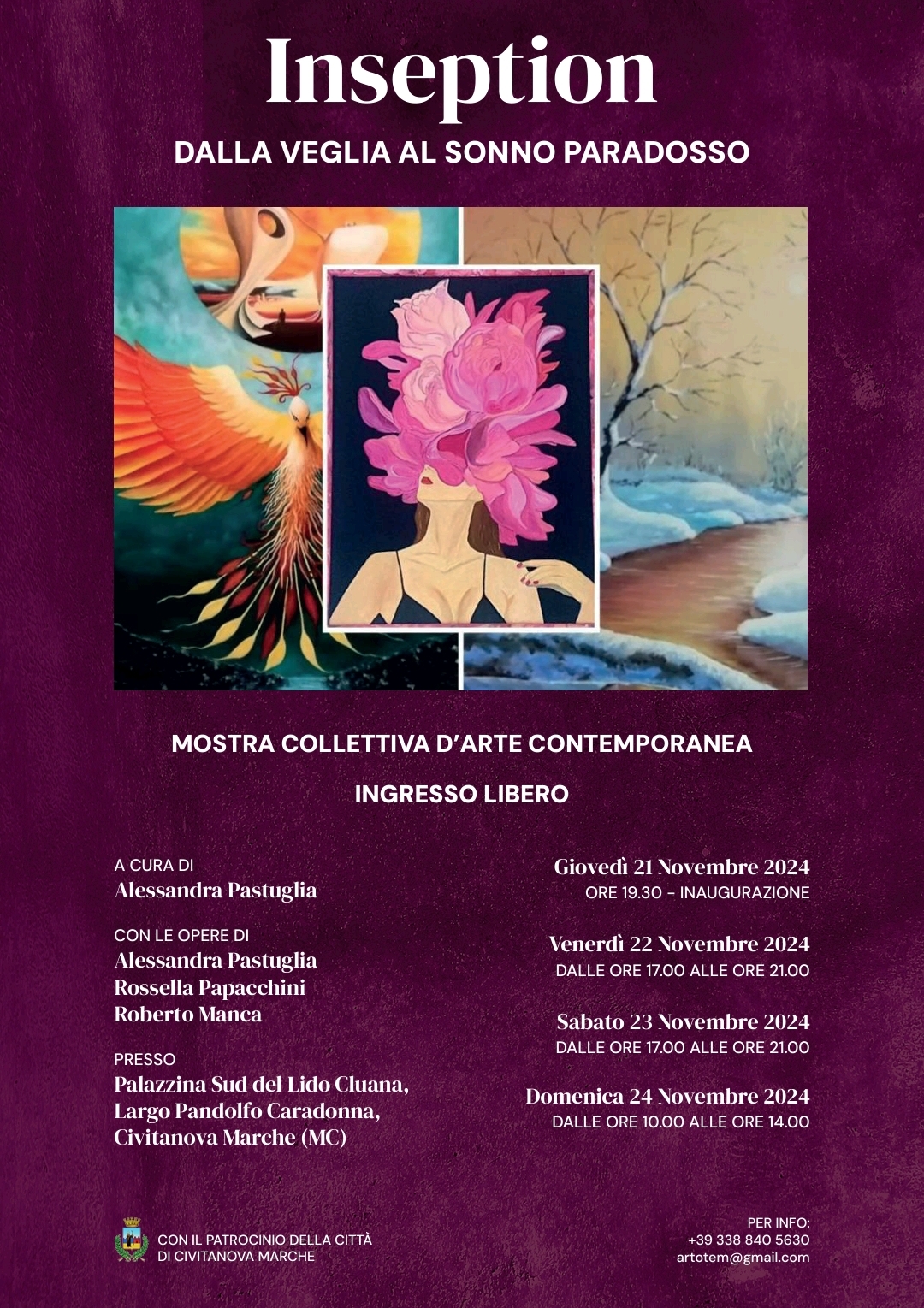 INSEPTION. DALLA VEGLIA AL SONNO PARADOSSO. La mostra si ispira al capolavoro fanta-onirico di Christopher Nolan e attraverso una discesa nell’in sé più profondo ripercorre gli stadi del sonno: la veglia, il sonno profondo ed infine il sonno paradosso, vivendo l’incubazione del sogno lucido.