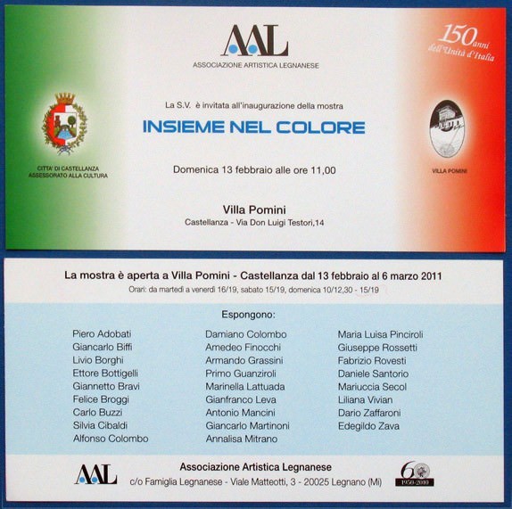 La mostra dei creativi dell’Associazione Artistica Legnanese, che si tiene dal 13 febbraio al 6 marzo 2011 nello spazio espositivo di Villa Pomini a Castellanza (Varese), ha per titolo “Uniti nel colore” e si ispira ai 150 anni dell’Unità d’Italia, rientrando nelle celebrazioni previste dall’Amministrazione comunale della città varesina.