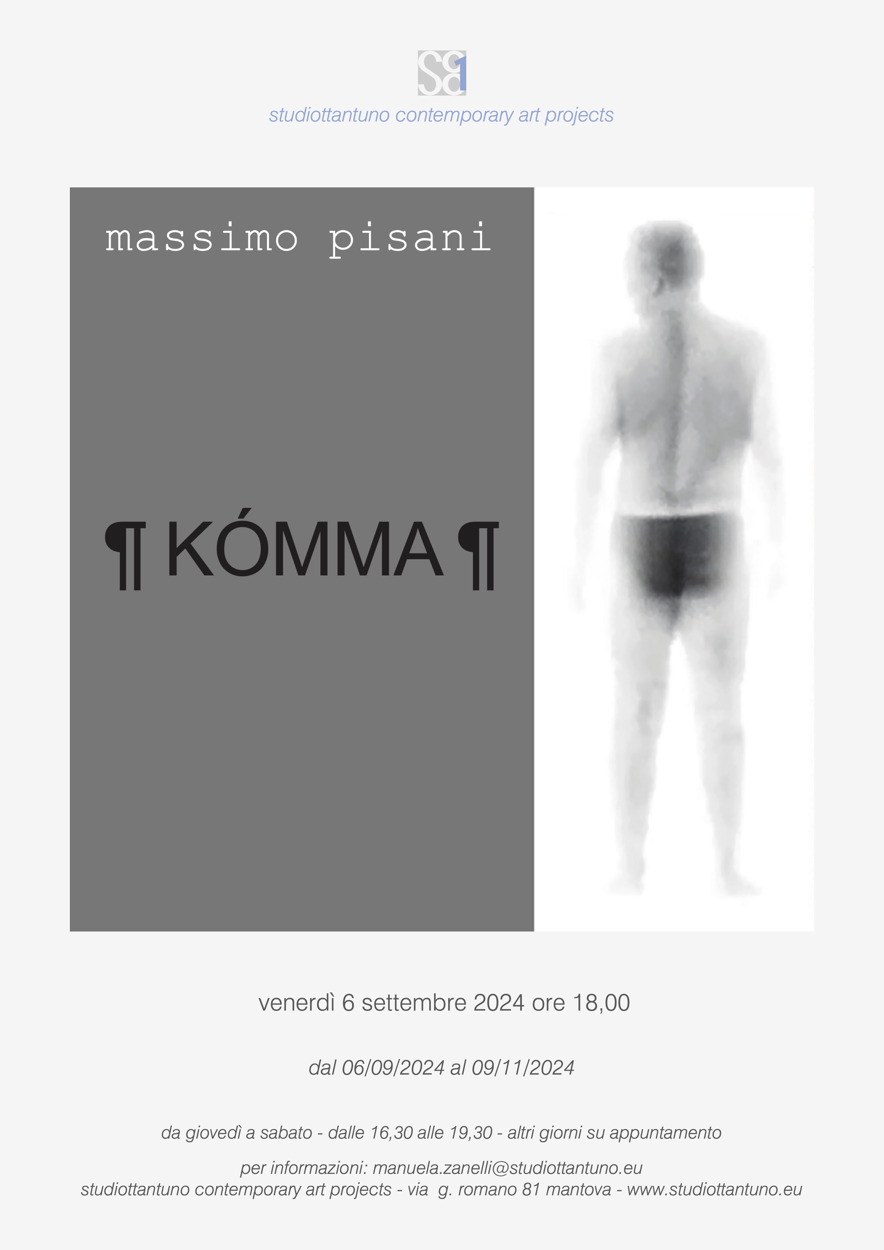 Studiottantuno Contemporary Art Projects presenta la mostra di Massimo Pisani "Kómma", un percorso nelle opere dell'artista che cerca di approfondire una linea del suo lavoro non tanto cronologica ma di senso, con un attraversamento spazio- temporale che nelle stanze della galleria presenta nuclei di lavori connessi tra loro da un significato che va oltre il significato stesso delle opere e si pone come principio di fondo della sua ricerca: quella capacità di partire dalle cose concrete per risignificarle e dare origine a nuove azioni-narrazioni evocative di memoria individuale e collettiva, di creare scene allusive ricche di simbologie, di riferimenti culturali, simulando con installazioni, video proiezioni e musica, oggetti e scritture contesti capaci di coinvolgere il fruitore, fare riflettere e stimolare una presa di coscienza etico-estetica che è anche quella dimensione concettuale in cui si radica la sua idea di arte.