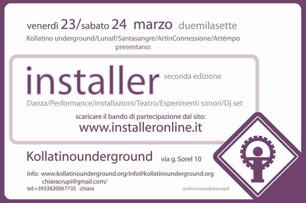 La seconda tappa del progetto INSTALLER vede nuovamente il Kollatino Underground promuovere e aprire al pubblico - per due giorni - uno spazio di lavoro e performativo polifunzionale, che ospiterà forme d'arte contemporanea - performance, teatro, danza, musica, installazioni, video - applicate ai mezzi della tecnologia digitale e meccanica.