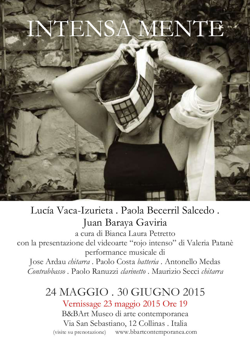 La stagione primaverile si inaugura al B&BArt museo di arte contemporanea a Collinas con la mostra “Intensa mente” che ha per protagonisti tre artisti internazionali: Paola Becerril Salcedo, Juan Baraya Gaviria e Lucía Vaca-Izurieta. L’esposizione a cura di Bianca Laura Petretto sarà presentata durante il vernissage del 23 maggio 2015 alle ore 19 con l’introduzione del videoarte “rojo intenso” di Valeria Patanè e la performance musicale di Jose Ardau chitarra . Paolo Costa batteria . Antonello Medas Contrabbasso . Paolo Ranuzzi clarinetto . Maurizio Secci chitarra.