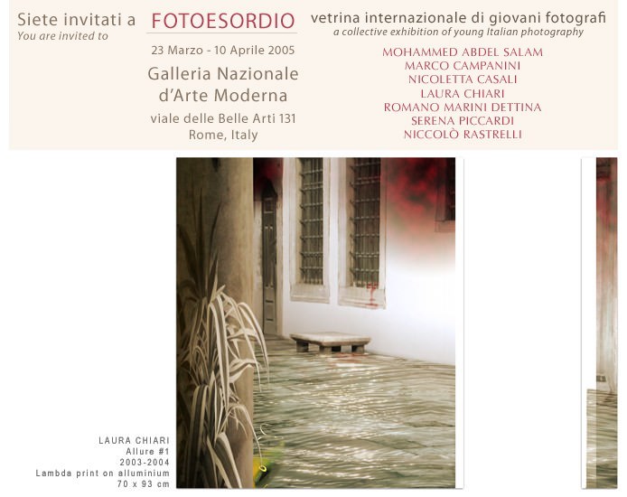 Mercoledì 23 Marzo p.v. e martedì 19 Aprile p.v. sarà la volta di un nuovo appuntamento della rassegna Interfacce IV edizione, manifestazione interdisciplinare dedicata ai linguaggi della contemporaneità a base tecnologica e all’ICT (Information&Communication Technology). Nella fattispecie verrà inaugurato Fotoesordio, una delle cinque vetrine di Interfacce, dedicata al linguaggio fotografico. Quest’anno la giuria – composta da Carlo Giovannella, Angela Rorro, Simona Sansonetti, Franco Soda, Francesca Vannucchi e Stefano Varano – ha selezionato fra i tanti lavori partecipanti al concorso, 22 opere realizzate da giovani provenienti dai corsi di fotografia delle migliori scuole italiane e straniere e Accademie di Belle Arti e da artisti under 35. Gli autori selezionati sono: Mohammed Abdel Salam, Enrico Abrate, Tania Alineri, Toni Arnau Masanet, Maria Rebecca Ballestra, Marco Campanini, Valeria Carvelli, Nicoletta Casali, Laura Chiari, Stefano Ciannella, Chiara Cochi, Gilberto Deberardis, Lucia Lacirignola, Fabio Listrani, Gemis Luciani, Lucia Marana, Romano Marini Dettina, Massimiliano Miglierina, Silvia Noferi, Serena Piccardi, Niccolò Rastrelli ed Elena Villa.