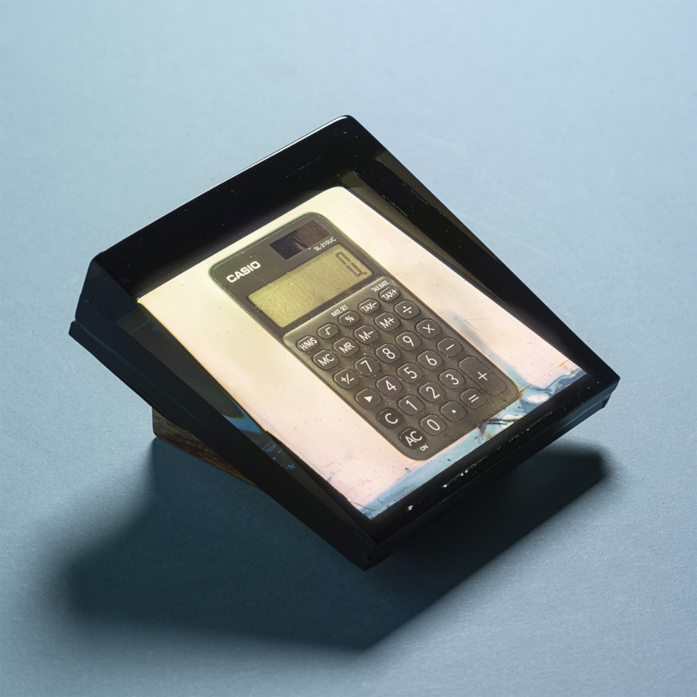 Quanto straordinaria e sapiente è la tecnica, tanto, per contrappunto, sono ordinari e consueti i soggetti ritratti dall’artista, che nella sua poetica attinge agli oggetti del nostro quotidiano. Con un banco ottico che permette una messa a fuoco totale, Salvà impressiona e poi sviluppa frammenti che raccontano le nostre vite. Nella visione solitaria si scorgono una calcolatrice, un libro, una macchina fotografica vintage e una sequenza di farmaci d’uso comune, ritratti secondo gli stilemi della fotografia pubblicitaria. Gli Still Life di Salvà sono pezzi unici, che fanno però incursione nella consuetudine delle nostre case, dei nostri cassetti, della nostra memoria: vividi nei colori appaiono quasi tridimensionali grazie alla iper-definizione dei dettagli. La fenomenologia dell’Aulin, che compare e scompare fulgido di luce, evidenzia la posologia della nostra quotidianità, in bilico tra la straordinarietà della tecnica e l’ordinarietà dei soggetti. L’avanzato sistema interferenziale ingegnerizzato dall’artista, tra chimica e fisica, governa la luce, riproducendo quel fenomeno iridescente che in natura scorgiamo nelle bolle di sapone, nelle conchiglie madreperla, nelle farfalle “blu”. Le Lippmann Plate di Salvà regalano ai nostri oggetti di casa quell’inafferrabile bagliore di universo.