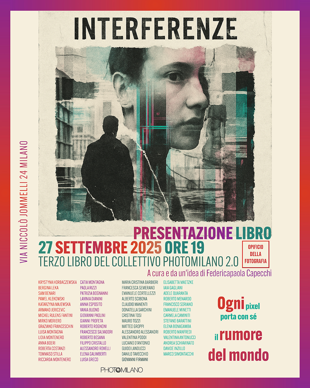 Cinquantanove fotografi selezionati per raccontare, con un libro e una mostra, interferenze. Polacchi, londinesi, croati, italiani che vivono all’estero e altri rimasti qui. Di questi, trentuno sono anche nella mostra fotografica collettiva che inaugura a Milano venerdì 19 settembre 2019 alle ore 19. Una forte impronta internazionale che non è solo geografica, ma di sguardo: leggere il tema delle interferenze attraverso contesti e sensibilità diverse, rende evidente come la fotografia possa essere al tempo stesso linguaggio universale e strumento critico per interpretare le complessità del presente.