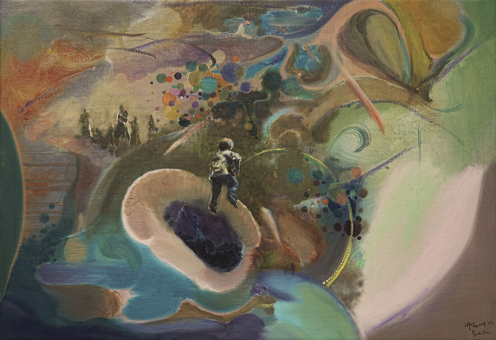Matteo Casali Caramello è nato nel 1994, diplomato in informatica e successivamente in pittura all’Accademia di Venezia, attualmente vive, studia e lavora a Venezia. È un artista visivo che esplora la pittura come linguaggio in continua evoluzione, un processo infinito di tentativi, bozzetti e frammenti che, nel loro insieme, costituiscono un unico flusso espressivo. Le sue opere si concentrano sulla tensione tra l’essere e il divenire, studiate attraverso ciò che egli chiama “abbau iconico”, metodo di sintesi segnica tratto da Heidegger, con figure che emergono come presenze sospese, frammenti di una realtà in costante trasformazione. Attraverso una pratica che include sia il medium tradizionale che la sperimentazione digitale, come la realtà virtuale e gli NFT, Casali crea opere che interrogano il confine tra il visibile e l’invisibile, il tangibile e l’immateriale. Questa ricerca riflette la sua visione della pittura come un tentativo continuo di dare forma all’invisibile, una resistenza al tempo e alla dissoluzione, un modo per esplorare ciò che persiste nella frizione e nel cambiamento. Ha esposto in contesti internazionali come ART TAIPEI in Taiwan e Rea! Art Fair a Milano.