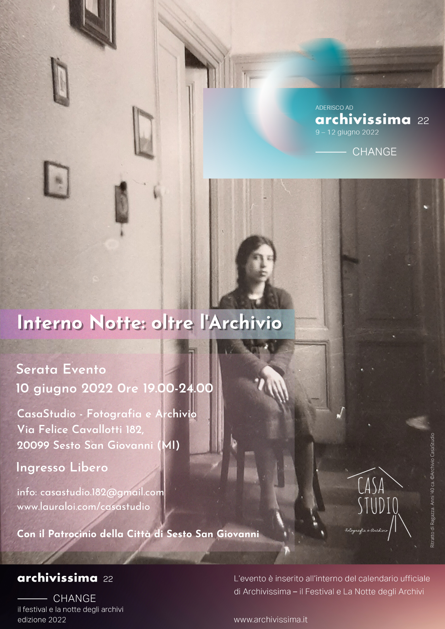 In sintonia con il tema di quest’anno scelto dall’Associazione Archivissima, #change, l’evento desidera essere uno spunto di riflessione su una nuova, possibile lettura - e dunque un cambiamento - nell’approccio ai particolari documenti fotografici che sono quelli di origine privata, familiare e amatoriale custoditi nell’Archivio CasaStudio. Non solo un interesse costante e attivo verso la loro raccolta e conservazione - in quanto testimoni di epoche, costume e società - ma una nuova ricerca e un’inedita interpretazione delle immagini nella loro composizione o scomposizione, dei soggetti ritratti come protagonisti a sé stanti o rinnovati personaggi universali di nuove storie, racconti, esperienze. Implementare la memoria con un passato che può diventare anche presente narrante,