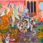 Le tinte forti e luminose delle opere di Camatta si ritrovano anche nelle tavole di Pietro Mancuso (Valdobbiadene, 1944), maestro della sfumatura capace di costruire, a partire dai propri riferimenti visivi quotidiani, universi caleidoscopici di città porticate silenziose e abitate da creature scaturite dal sogno dei loro abitanti: esseri umanoidi che si mischiano ad animali e vegetali ritrovando un’armonia perduta. Il tempo, clessidra che assilla le nostre frenetiche vite, è un elemento sempre presente in queste visioni oniriche, talvolta in forma biblica come mela, spesso nel nobile genere della natura morta, che non è mai intrisa di vanitas ma piuttosto propone una riflessione privata sul valore della bellezza del quotidiano.