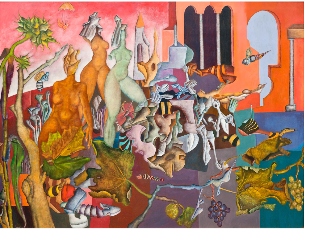 Le tinte forti e luminose delle opere di Camatta si ritrovano anche nelle tavole di Pietro Mancuso (Valdobbiadene, 1944), maestro della sfumatura capace di costruire, a partire dai propri riferimenti visivi quotidiani, universi caleidoscopici di città porticate silenziose e abitate da creature scaturite dal sogno dei loro abitanti: esseri umanoidi che si mischiano ad animali e vegetali ritrovando un’armonia perduta. Il tempo, clessidra che assilla le nostre frenetiche vite, è un elemento sempre presente in queste visioni oniriche, talvolta in forma biblica come mela, spesso nel nobile genere della natura morta, che non è mai intrisa di vanitas ma piuttosto propone una riflessione privata sul valore della bellezza del quotidiano.