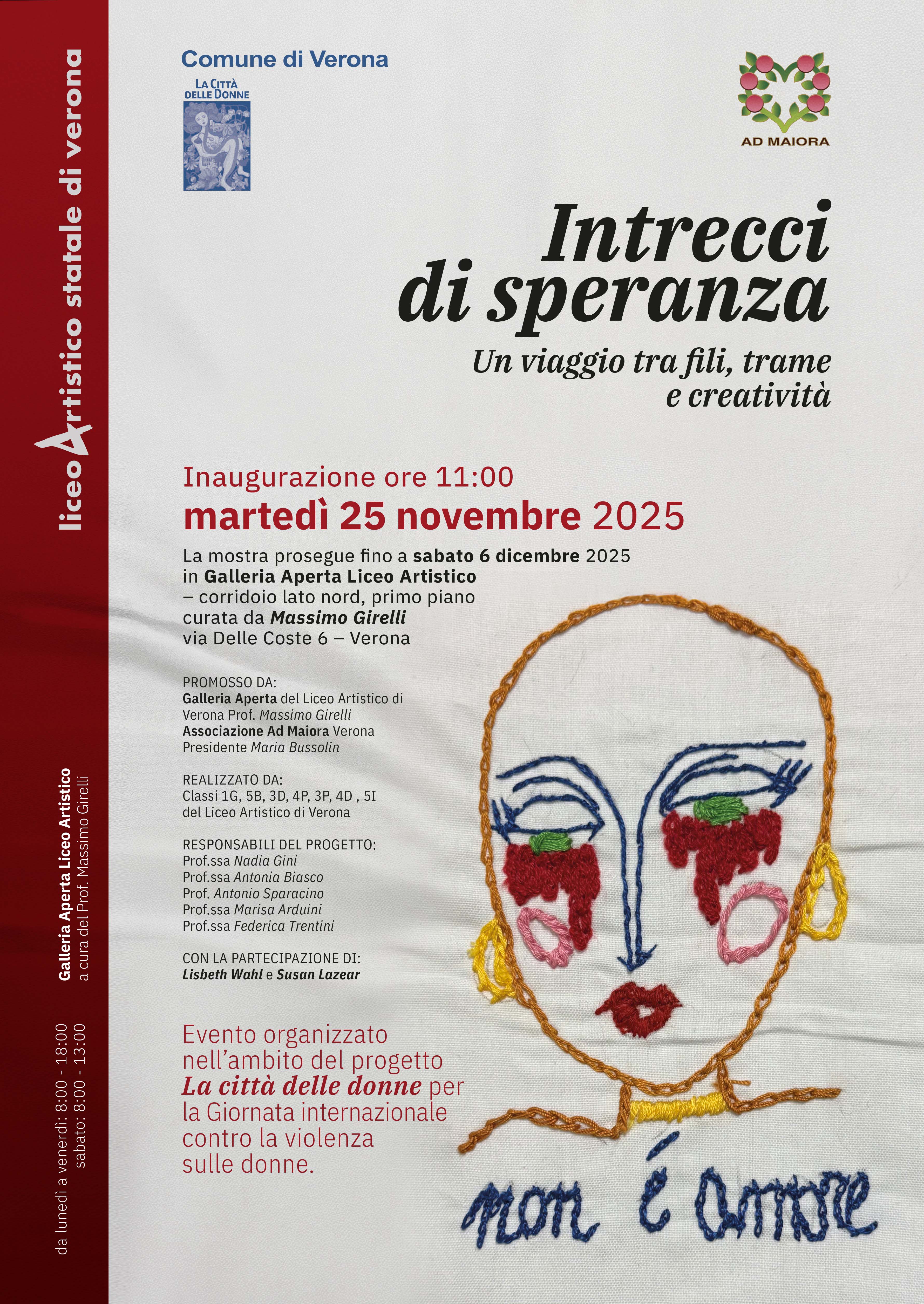 Il Liceo Artistico di Verona è lieto di annunciare l'inaugurazione della mostra "INTRECCI DI SPERANZA: un viaggio tra fili, trame e creatività", evento nell'ambito del progetto comunale "La città delle donne" per la Giornata internazionale contro la violenza sulle donne.