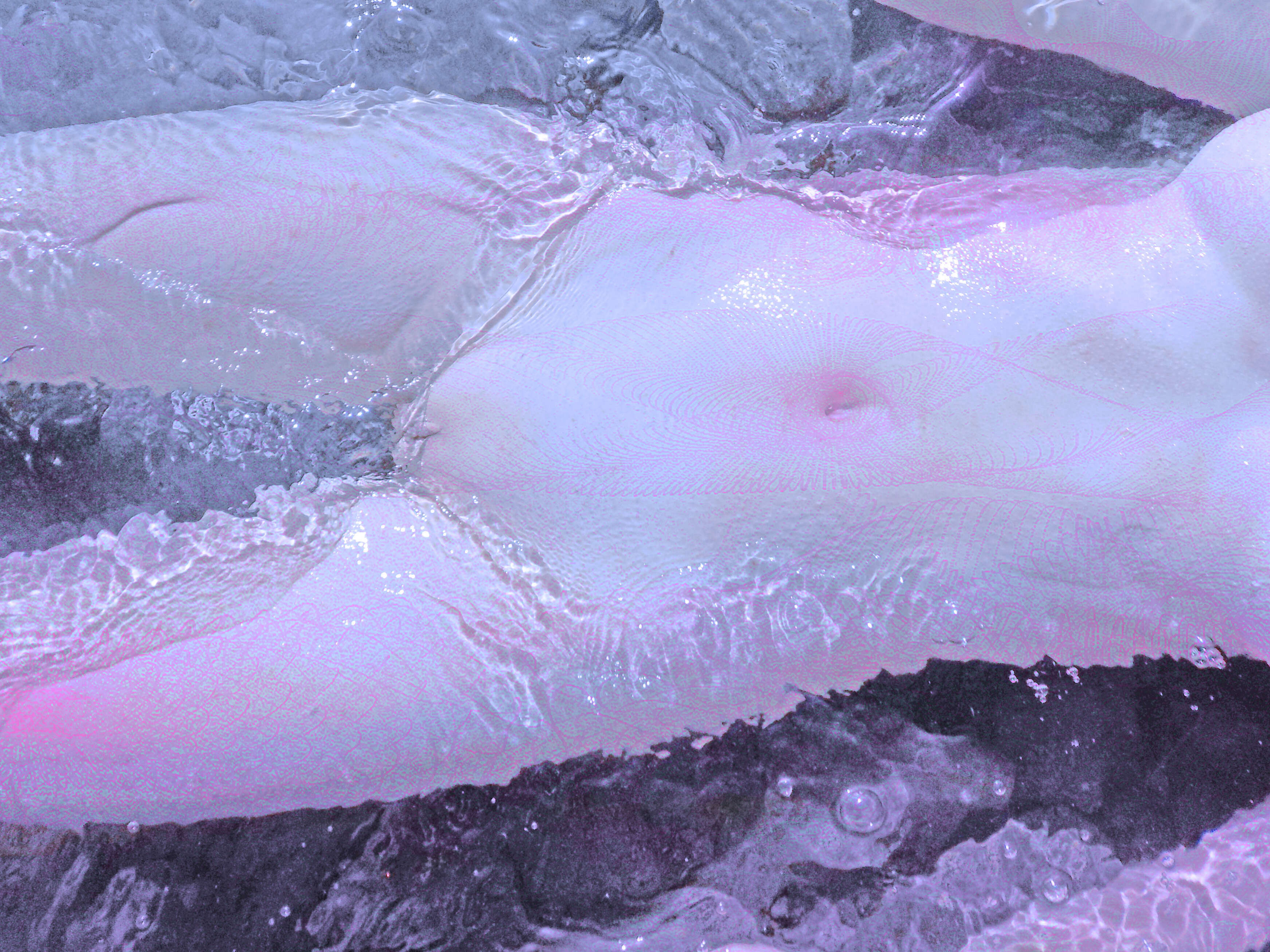Simone Frettoli_Come dei corpi antichi che affiorano dall'acqua e dalle profondità del bosco, si accosta l'essenza della dea primigenia, rossa di capelli, attraversa a grandi falcata il globo ricoperto d'acqua. Il femmineo recuperato nell'elemento di immersione, acqua come medium letterario, medium emotivo, medium di riconciliazione, elemento principe. Acqua fossile. La nudità esplorata nel candore delle forme. La parzialità delle forme del corpo nudo restituite come spazi di riflessione grafica. La chiave del significato delle onde cerebrali riflessa nelle parti del corpo. La sovrapposizione di immagini dalla mente che ritorna al corpo, la stratificazione del materiale immaginario, quando è concreto e onirico allo stesso tempo. Un parallelo ancestrale fra l'origine del nostro corpo e quello della nostra mente. Un richiamo dalle forme del corpo alle forme della mente. L'emanazione dell'essere dimenticata e poi ritrovata nel susseguirsi di eventi della vita, come un onda catturata dalle brane dello spazio tempo si rifrange riflette rinasce ridiscende nella magia della terra, del fuoco e dell'aria. L'acqua è il flusso eterno, lo scorrere della consapevolezza ritorna a noi nell'immagine frattale e caotica della reale vibrazione fisica, generata anch'essa dalla parola originaria, il battito delle ali dell'impermanenza.