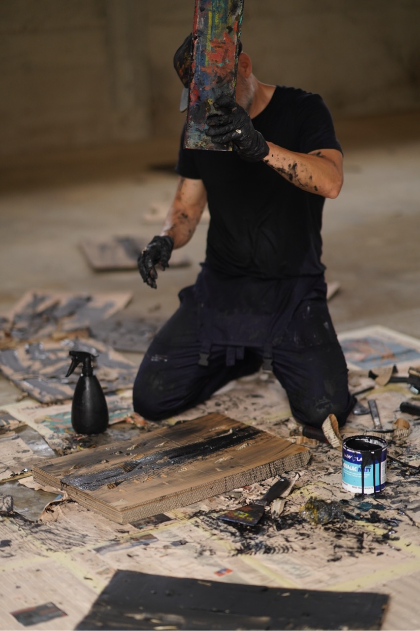 Mantieco utilizza vernice spray, colature acriliche, incisioni e strappi per indagare il margine fra controllo e deriva: gesti metodici e raptus che, reiterati, trasformano le superfici in mappe di fratture e lacerazioni.