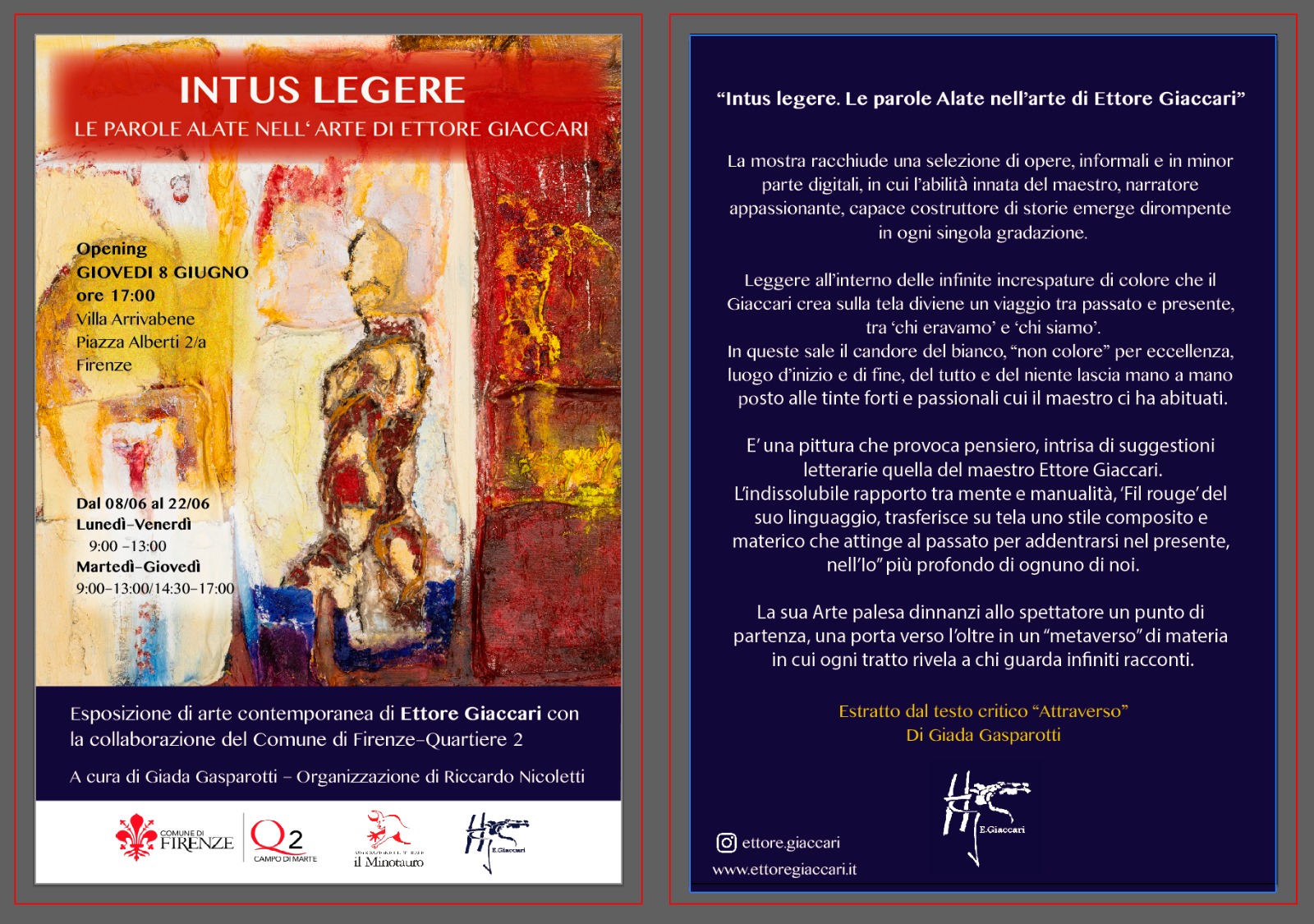 Dopo una memorabile esposizione in terra senese, Ettore Giaccari approda a Firenze per una nuova mostra dal titolo: “Intus legere. Le parole Alate nell’arte di Ettore Giaccari”