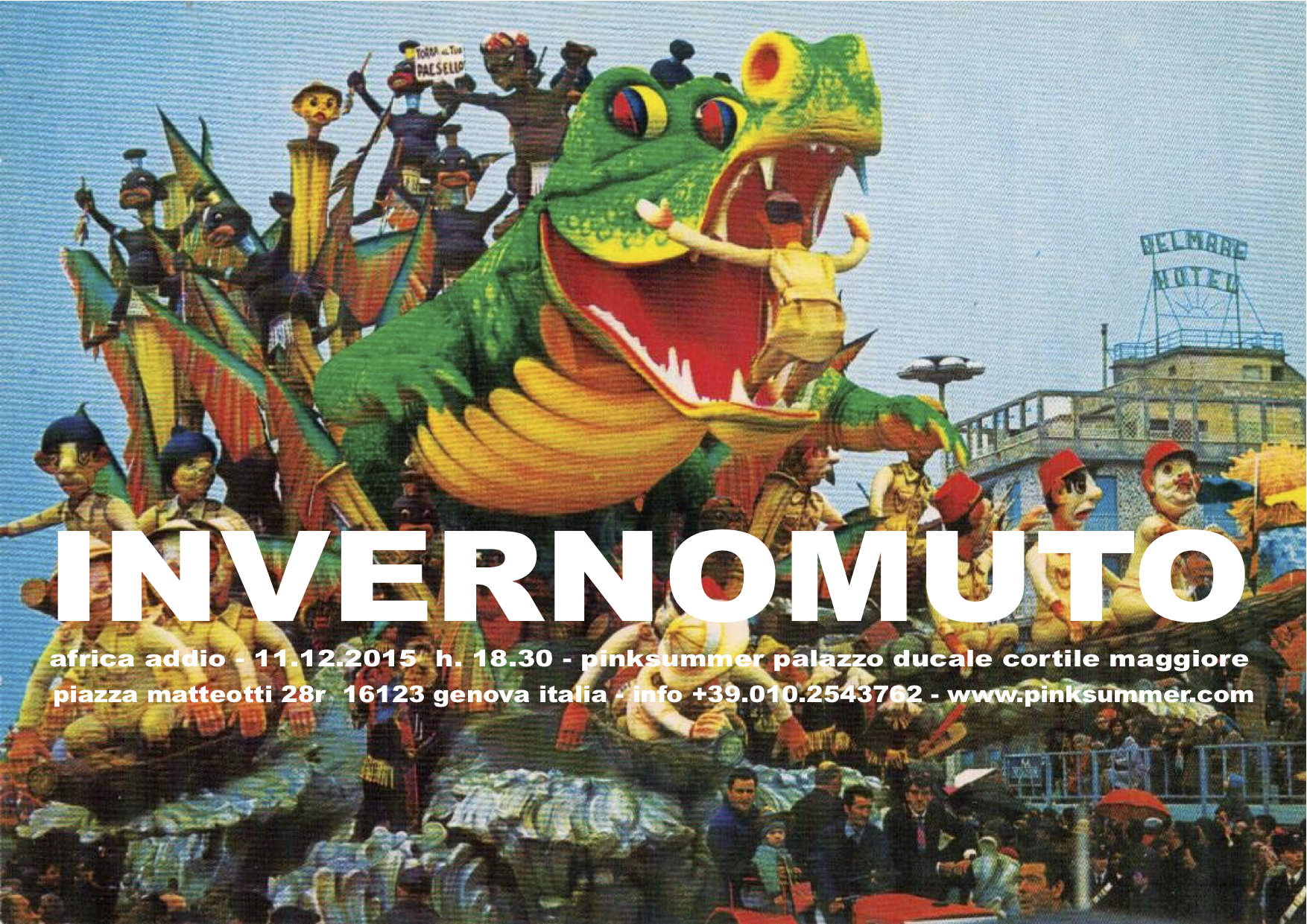 L’immagine usata per l’invito proviene da un carro del Carnevale di Viareggio di fine anni ’60 il cui nome era Africa Addio, il titolo alla mostra. Africa Addio è anche un film del 1966 diretto da Gualtiero Jacopetti e Franco Prosperi, un classico controverso del cinema Mondo. Il carro è molto articolato, ricco di dettagli, tra i quali spicca un cartello con la scritta “torna al tuo paesello”.