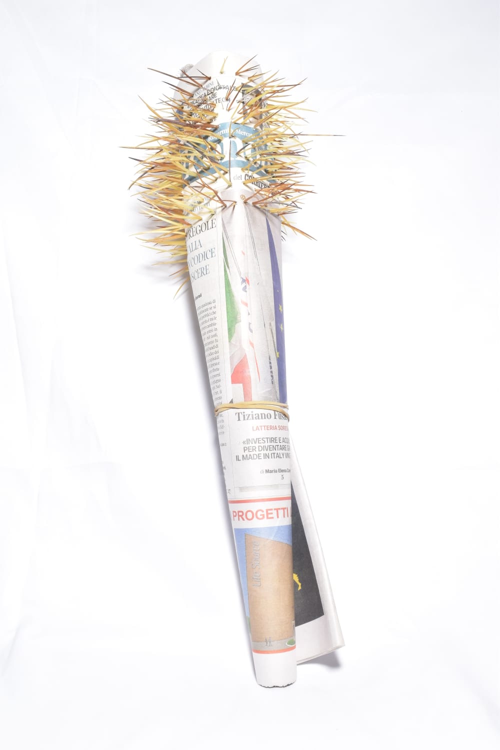 Nello spazio si avverte una tensione emotiva costante data dalle opere di Chiara Russo, Giornali, disposte tra i cunicoli come in una sala d’armi medievale. Le opere consistono di quotidiani cartacei arrotolati trafitti da spine in superficie come a ricordare l’immagine di una mazza chiodata. Questi oggetti ibridi, a metà tra strumenti di informazione e strumenti bellici, mettono in evidenza l’aggressività latente che caratterizza gran parte della narrazione mediatica contemporanea in bilico tra realtà, finzione e spettacolarizzazione. Le immagini e i titoli riportati sui media contribuiscono a una pressione emotiva costante e collettiva, così il giornale si trasforma in oggetto di violenza.