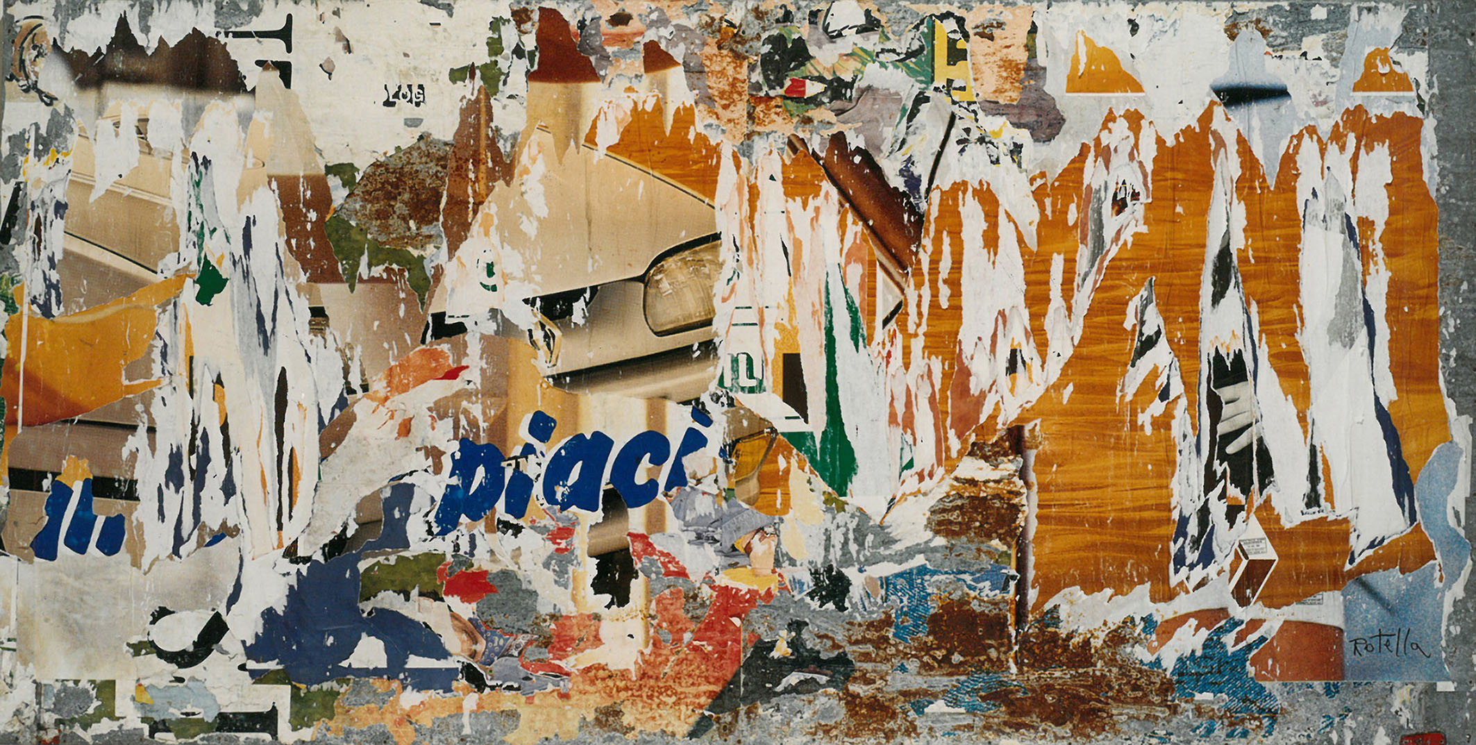 Mimmo Rotella (Catanzaro 1914 – Milano 2006) è tra i protagonisti dell’arte italiana del secondo dopoguerra. Dopo le prime prove pittoriche di matrice figurativa e neo-geometrica, intraprende una ricerca rivolta alle potenzialità autoespressive della materia. All’inizio degli anni Cinquanta a Roma mette a punto la tecnica del décollage, incollando su tela o altri supporti i manifesti (o il retro dei manifesti, nei retro d’affiches) strappati dai muri della città. Nel 1961 aderisce, su invito di Pierre Restany, al gruppo dei Nouveaux Réalistes e entra in contatto con gli affichistes francesi. Nelle opere successive, la riflessione sul principio di appropriazione delle immagini passa dal riporto fotografico della mec-art alle “maculature” degli artypo, sovrapposizioni fotografiche di prove di stampa. Il lavoro sui manifesti prosegue con le Plastiforme (1975), le Coperture o Blank (1981), Cinecittà 2 (1984) e le Sovrapitture (1987) ispirate al graffitismo. Da ricordare anche le sperimentazioni nel campo della poesia fonetica e la redazione del Manifesto dell’Epistaltismo (1949).
