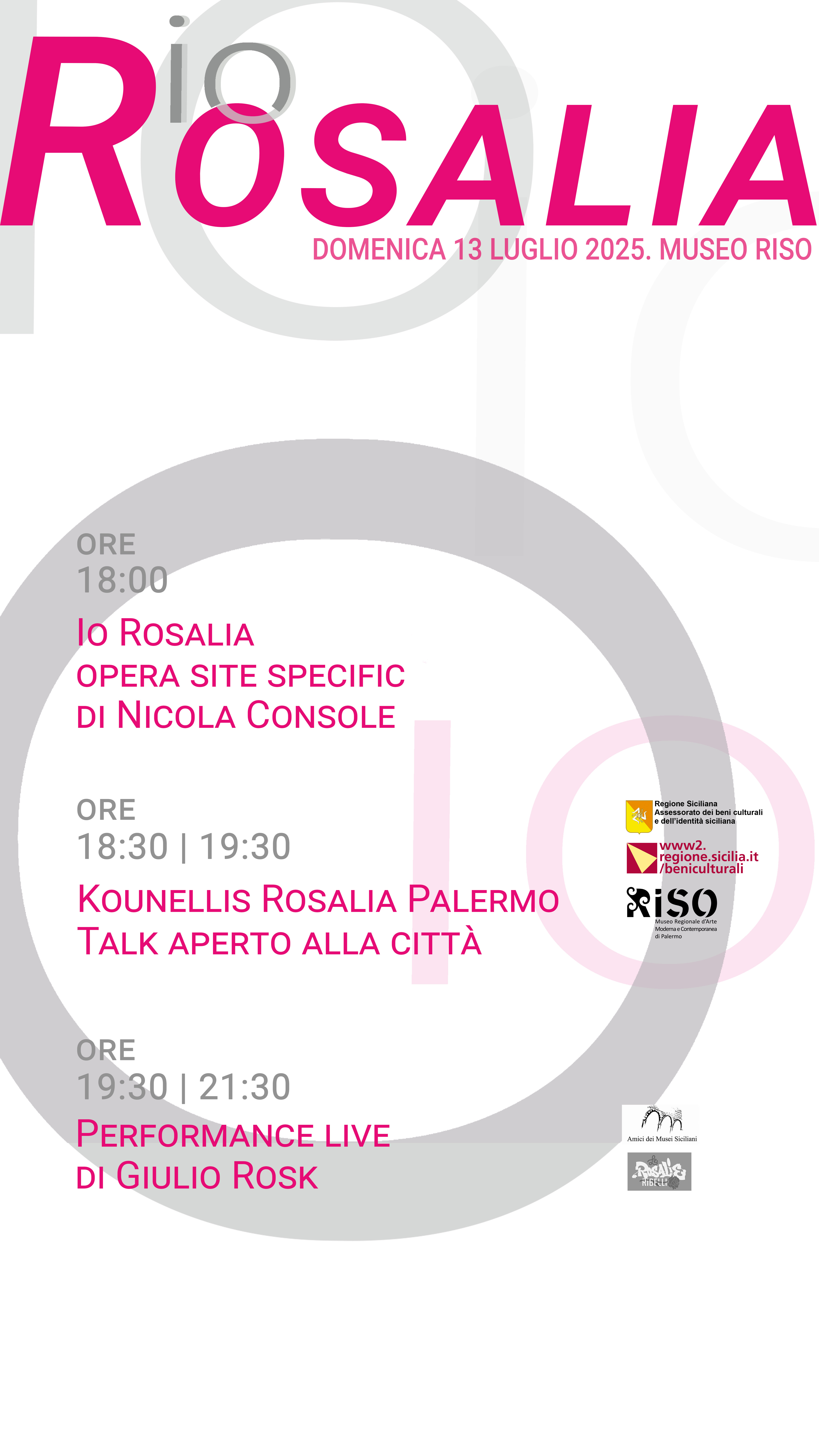 - Ore 19:30 – 21:30 – Performance live di Rosk. L’artista Giulio Rosk, autore del murale Le Rosalie Ribelli che dal 2024 fa da fondale al restaurato Carro di Kounellis allo Sperone, darà nuova vita all’immagine del murale, riproponendola live su un abito da sposa, indossato da una “Rosalia Ribelle”, in una performance accompagnata dalla soprano Valentina Di Franco e dalla pianista Annarita Di Chiara. L’azione artistica si pone in continuità e ulteriore rilancio della collaborazione tra il Museo e i promotori del Festino dello Sperone 2024, Associazione di volontariato L’Arte di Crescere, Associazione Amici dei Musei Siciliani, I.C.S. "Sperone-Pertini“. L’abito, che fa parte di una donazione di 80 abiti da sposa, da parte di un atelier palermitano che ha scelto l’anonimato, parteciperà ad ottobre all’azione di comunità “Abiti Ribelli” per finanziare la creazione di un’area fitness libera e pubblica nel quartiere Sperone. Esposto al Riso anche durante la serata di lunedì 14 luglio, l’abito costituisce un’occasione per rileggere la figura di Rosalia non solo come simbolo devozionale cittadino, ma come icona vivente, capace di rinnovare la devozione attraverso i linguaggi dell’arte, in una tensione costante tra passato e futuro, memoria e visione.