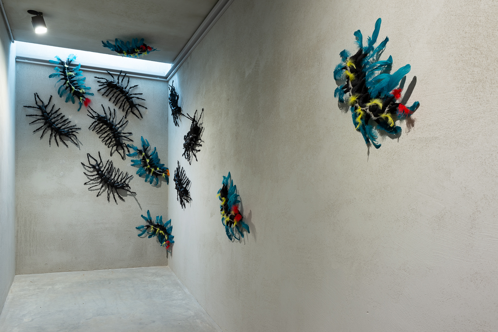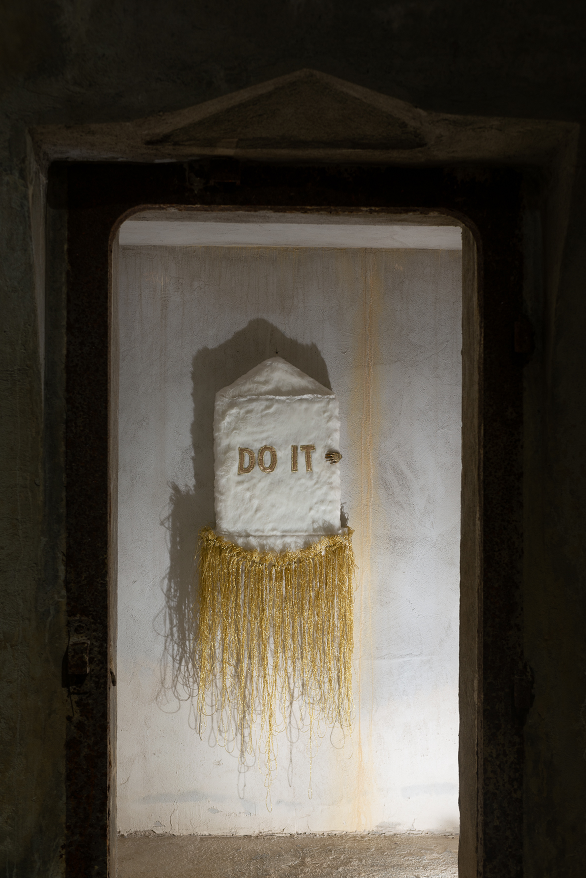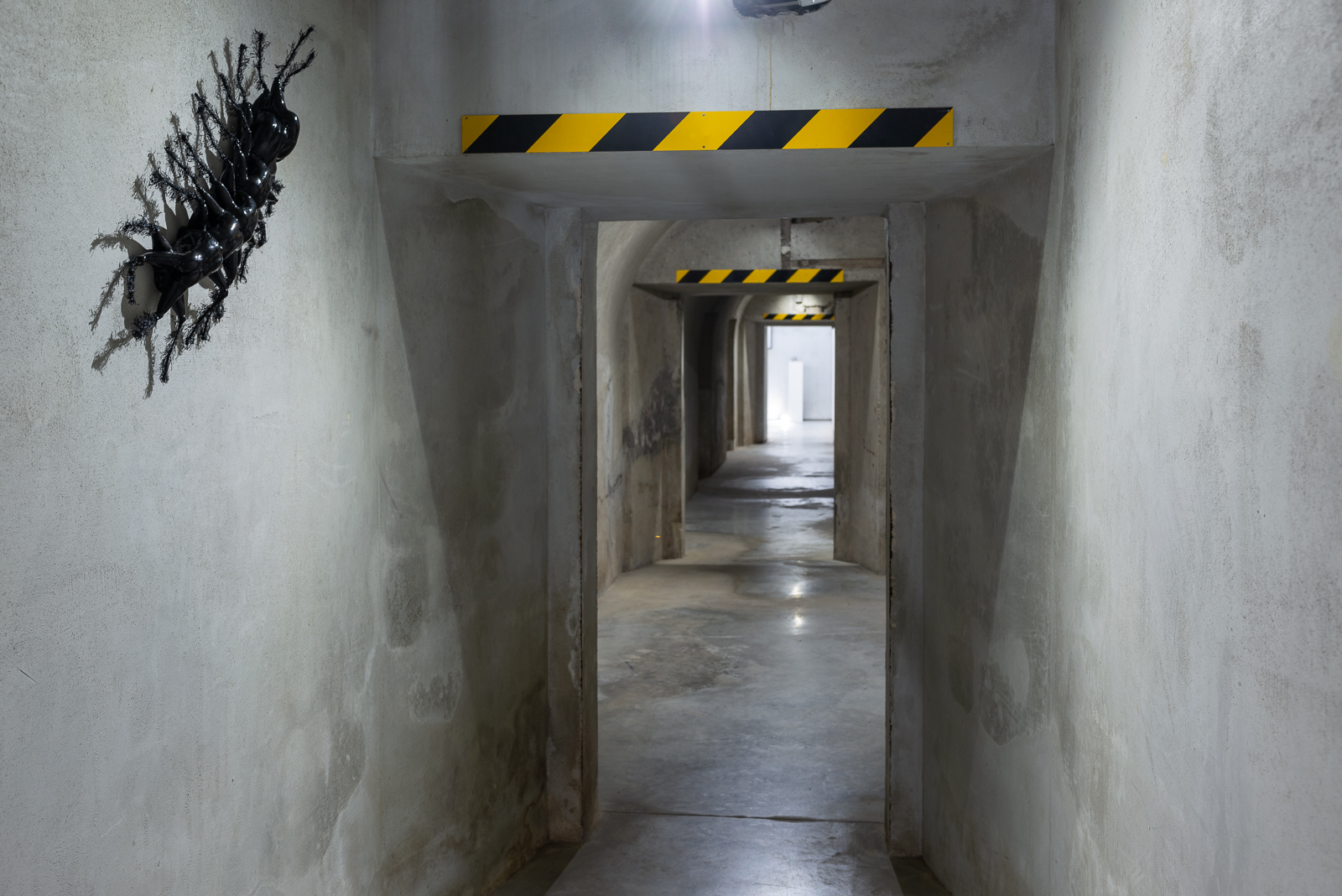 A sottolineare come un preciso contrappunto le opere dell’artista, sono le celle e le sale cieche che le accolgono come in una cassa di risonanza, aprendosi come dei “sancta sanctorum” lungo i cunicoli del sito che ospita la mostra: un bunker antiaereo realizzato durante il Secondo Conflitto Mondiale, che nel 1943-44 ha ospitato il Comando tedesco della Militar Sanitat.
