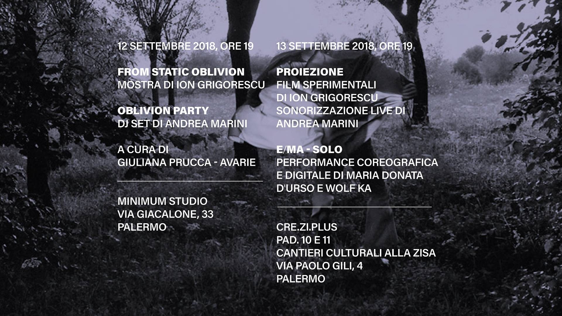 Ispirandosi al libro di Ion Grigorescu, From static oblivion, e alla dinamicità del suo montaggio, Giuliana Prucca, curatrice e direttrice artistica di AVARIE, propone il lavoro dell’artista contemporaneo rumeno, in una mostra che ne articola fotografia e video presso i locali di Minimum, a Palermo.